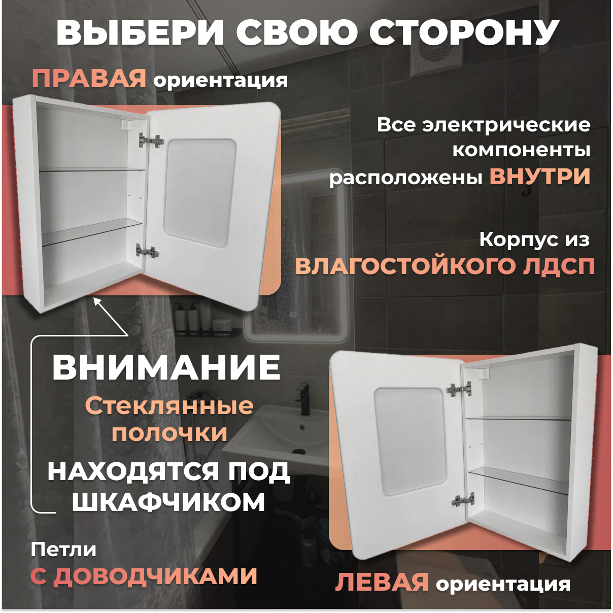 Зеркало шкаф с подсветкой в ванную Мира ЛАЙТ 65х75 правое, Подсветка холодная, белый
