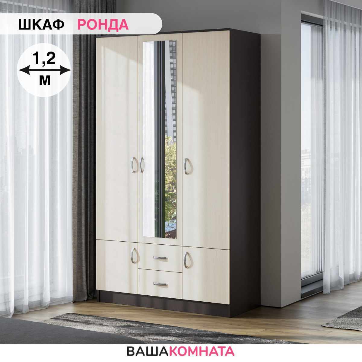 Шкаф распашной Берген ШК-1200, 3 зеркала Ронда ЗШК, кашемир (Интерьер-Центр)