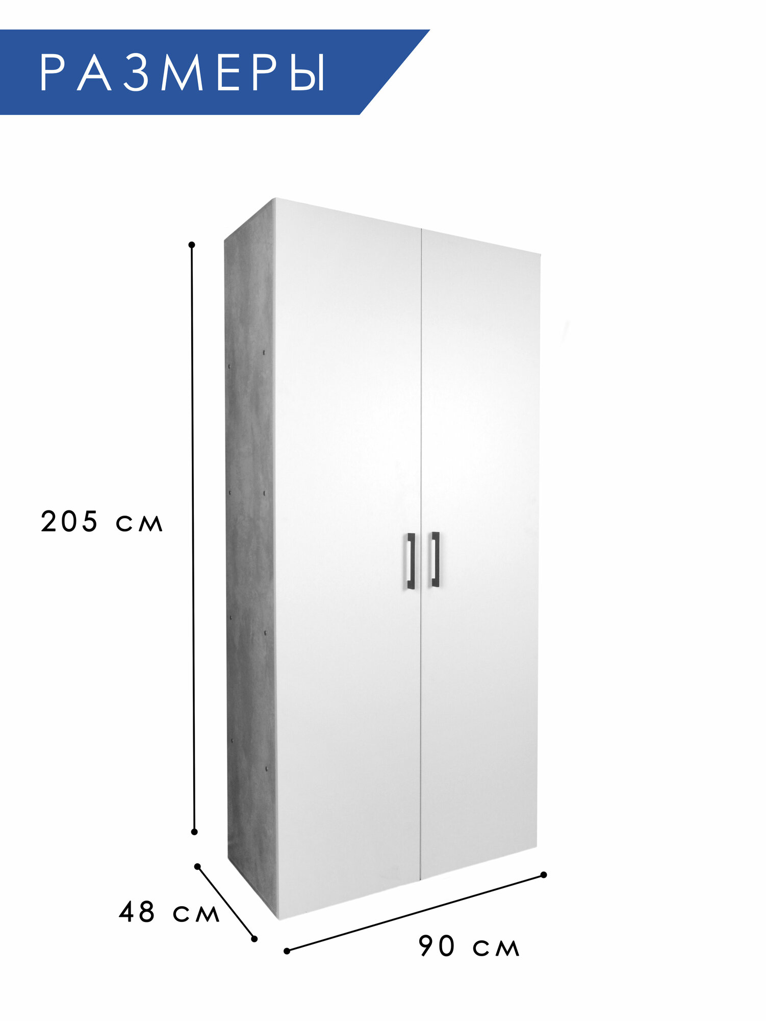 Шкаф двухдверный 205x90x48, Цемент/белый, 4 полки, штанга для одежды