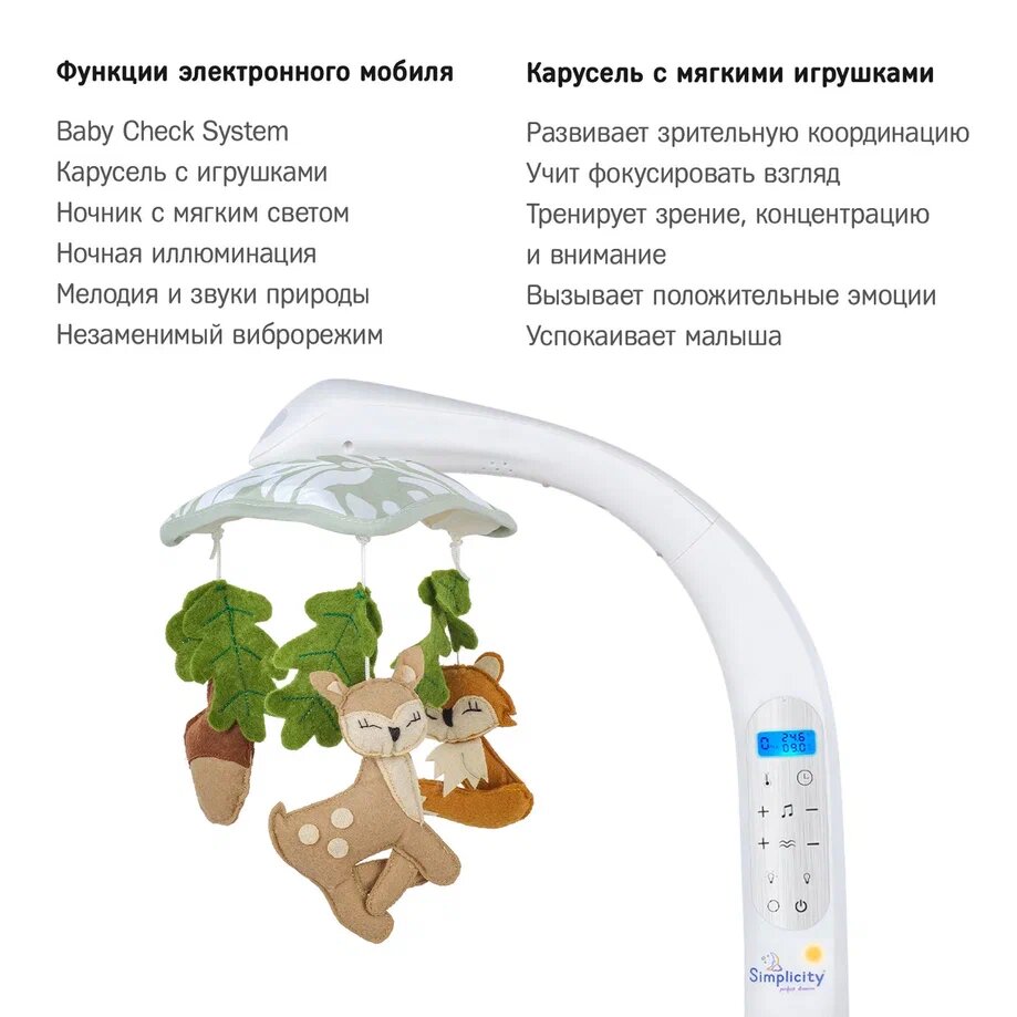 | Дополнительная информация | Функции мобиля: Карусель (5 мин), ночник (5 мин), музыка (5 мин), изменение громкости, виброрежим (5 мин), изменение интенсивности, иллюминация (5 мин), цифровой дисплей (подсветка 10 сек), датчик температуры и влажности, таймер мониторинга (шаг таймера 1 час) |