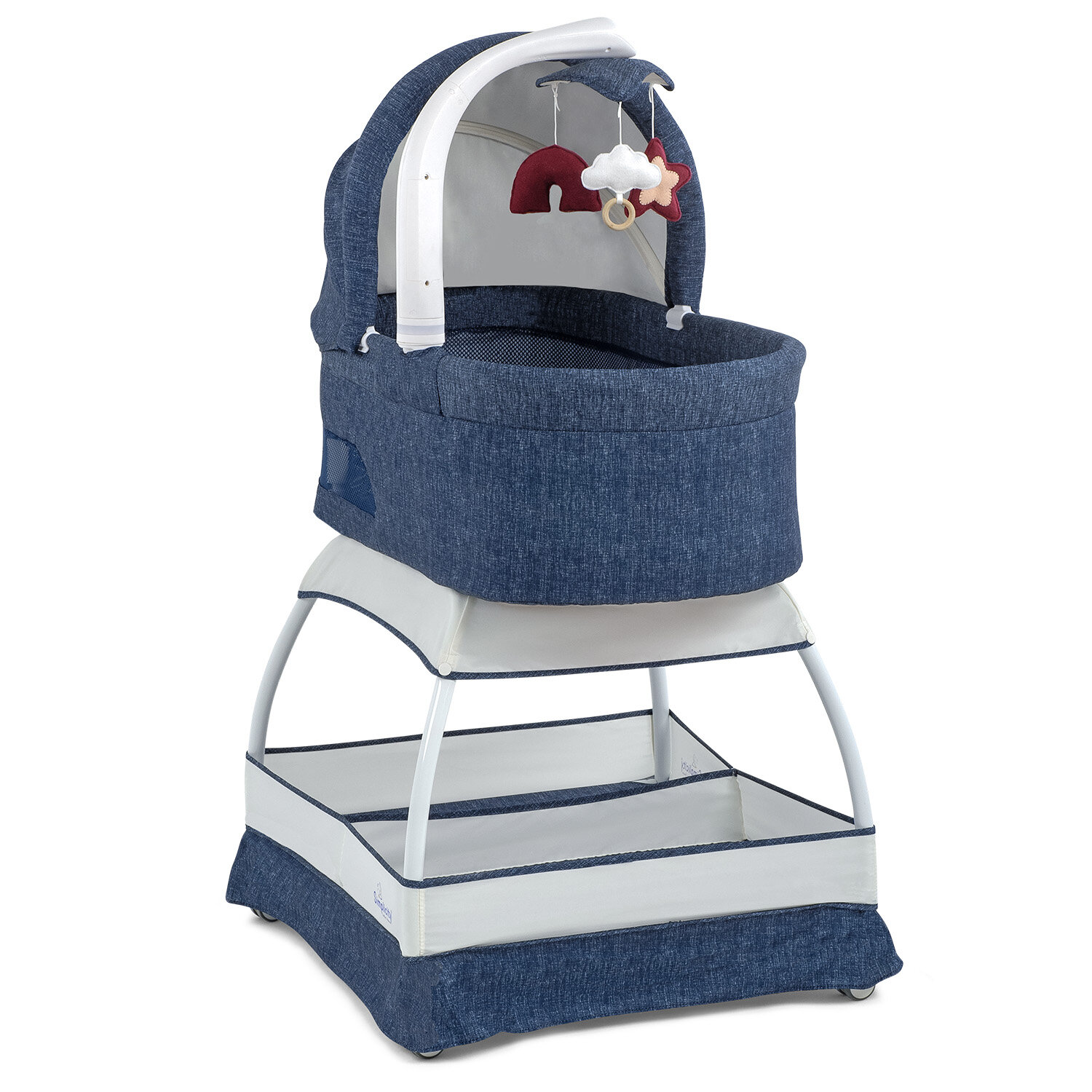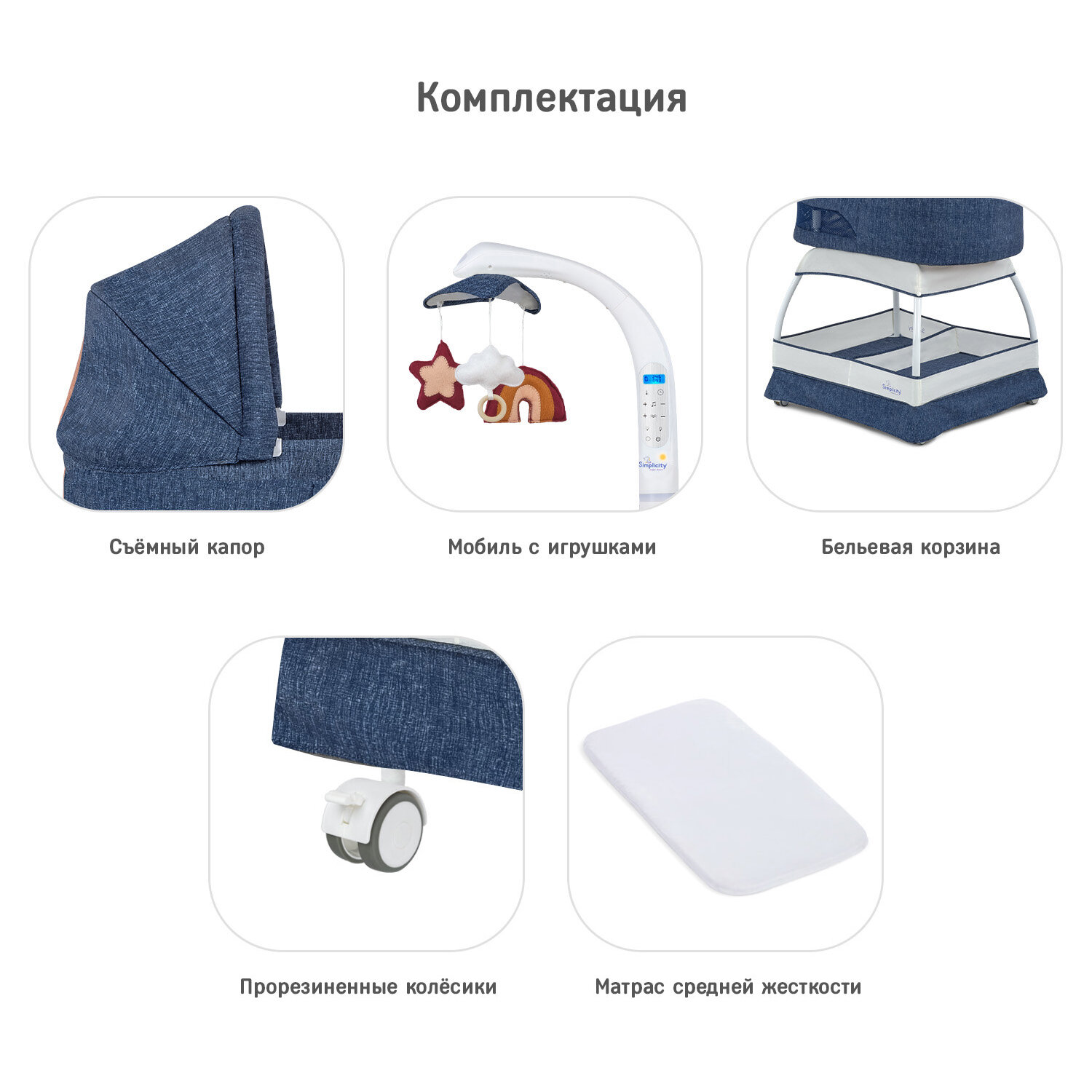 | Комплектация | колыбель / съёмный матрасик / наматрасник / капор / мобиль с тремя игрушками / тканевая корзина для белья. |