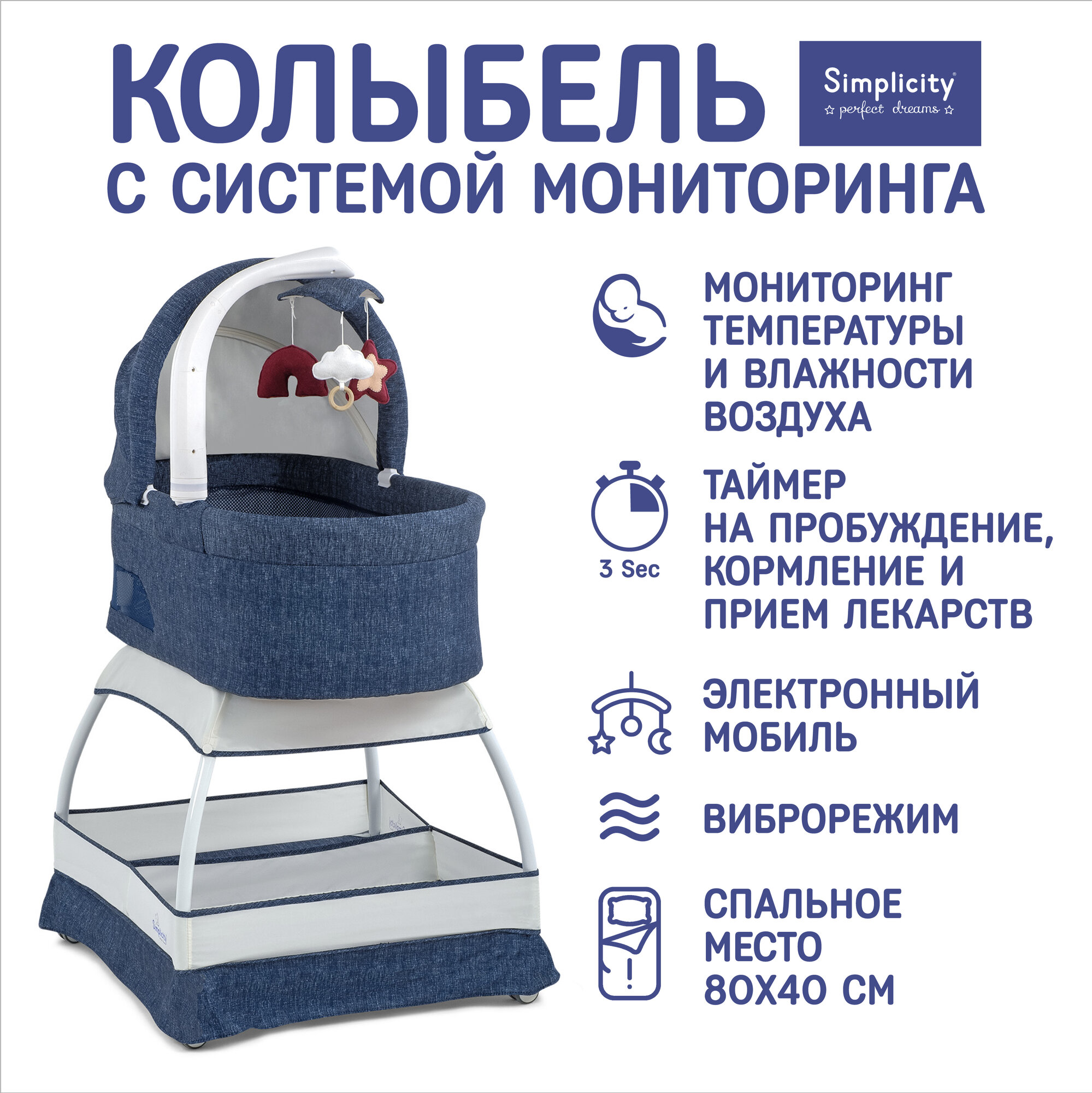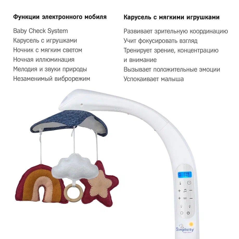 | Дополнительная информация | Функции мобиля: Карусель (5 мин), ночник (5 мин), музыка (5 мин), изменение громкости, виброрежим (5 мин), изменение интенсивности, иллюминация (5 мин), цифровой дисплей (подсветка 10 сек), датчик температуры и влажности, таймер мониторинга (шаг таймера 1 час) |