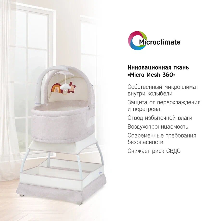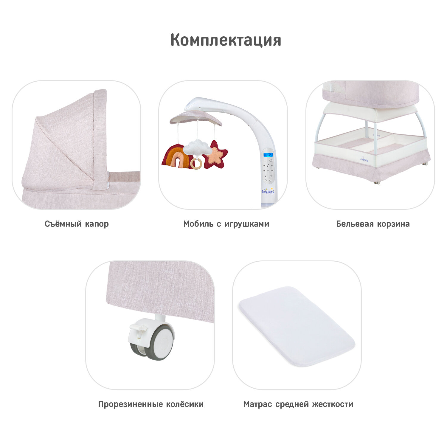 | Комплектация | колыбель / съёмный матрасик / наматрасник / капор / мобиль с тремя игрушками / тканевая корзина для белья. |