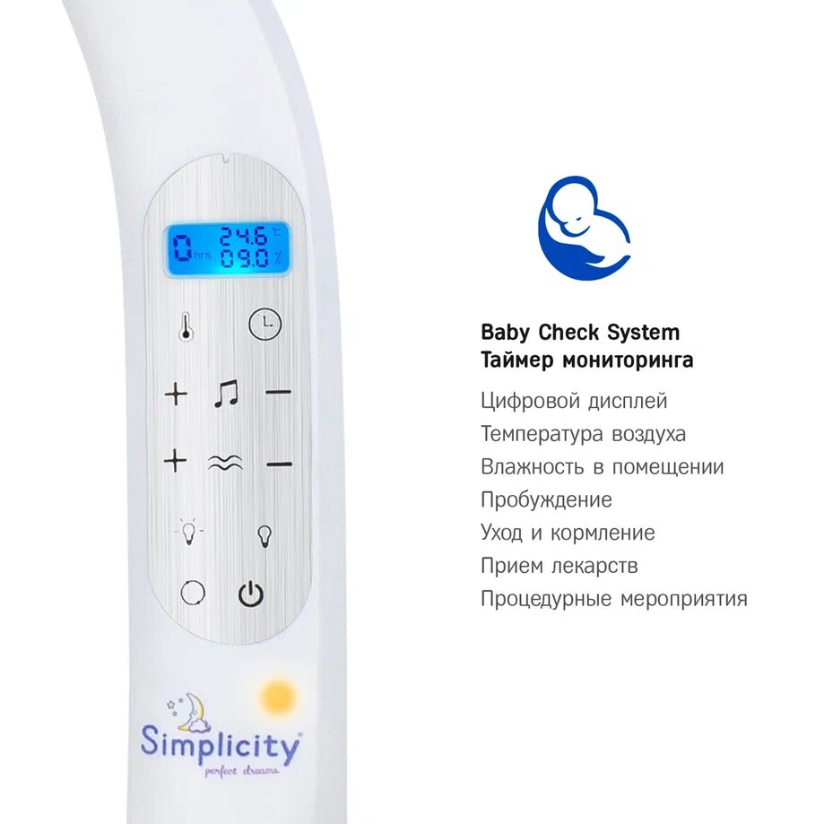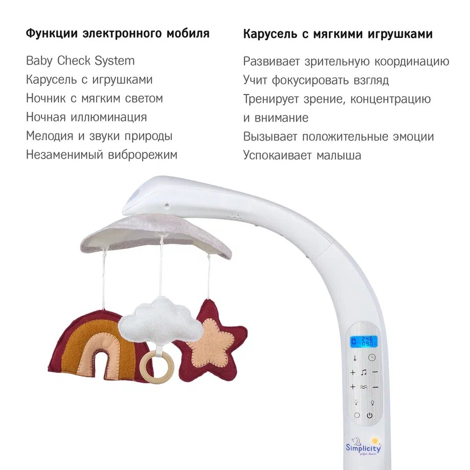 | Дополнительная информация | Функции мобиля: Карусель (5 мин), ночник (5 мин), музыка (5 мин), изменение громкости, виброрежим (5 мин), изменение интенсивности, иллюминация (5 мин), цифровой дисплей (подсветка 10 сек), датчик температуры и влажности, таймер мониторинга (шаг таймера 1 час) |