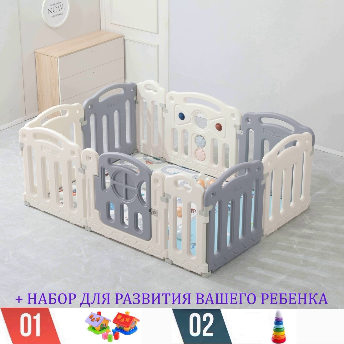 | Комплектация | манеж / калитка / игровая панель (бизиборд) / детский сортер / деревянная пирамидка / полиуретановый коврик толщиной 10 мм и набор из 30 разноцветных шаров |