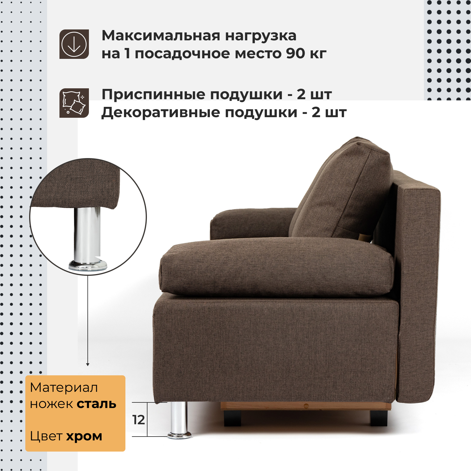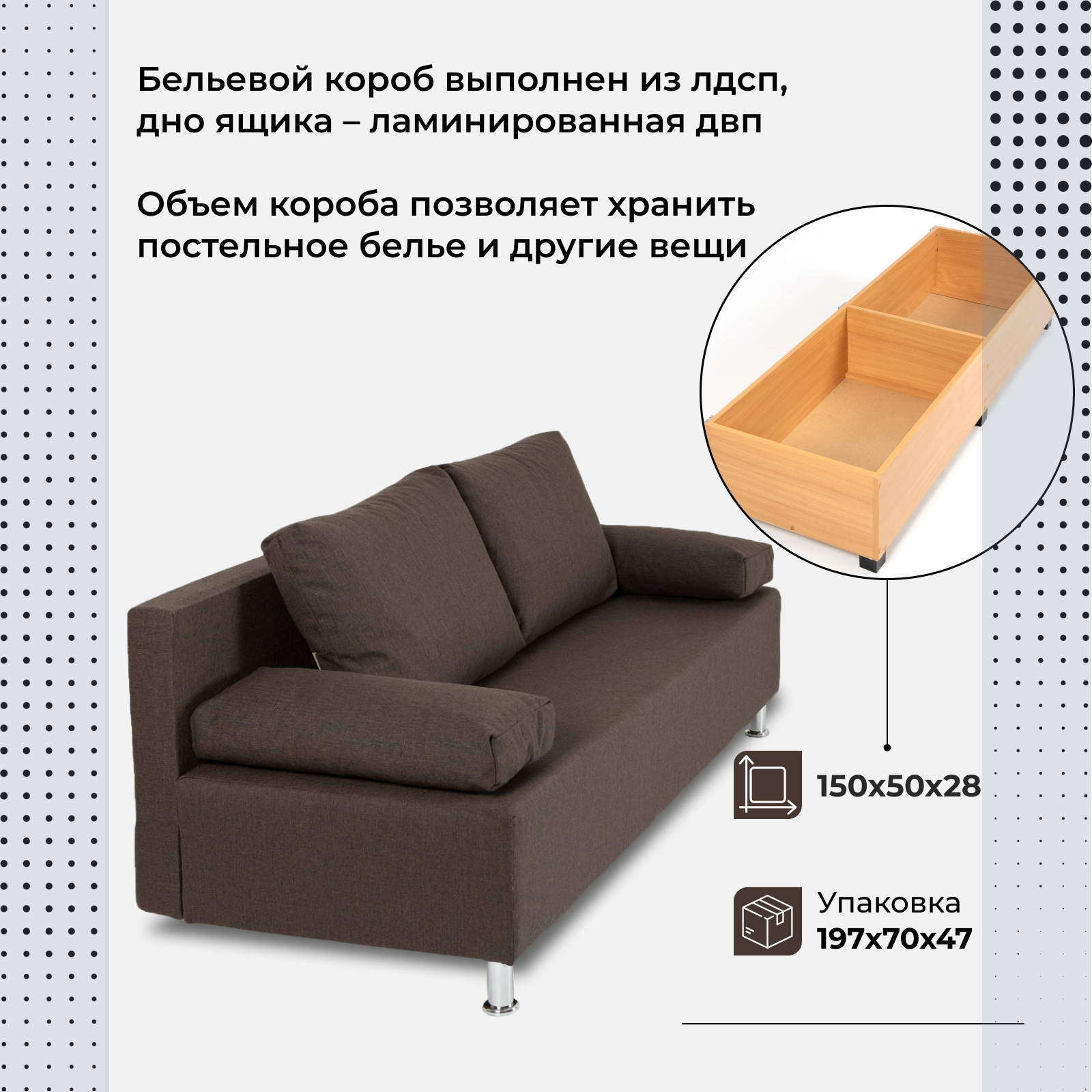 | Особенности | антивандальная обивка, раскладная конструкция, с подлокотниками, съемные подушки, ящик для белья |