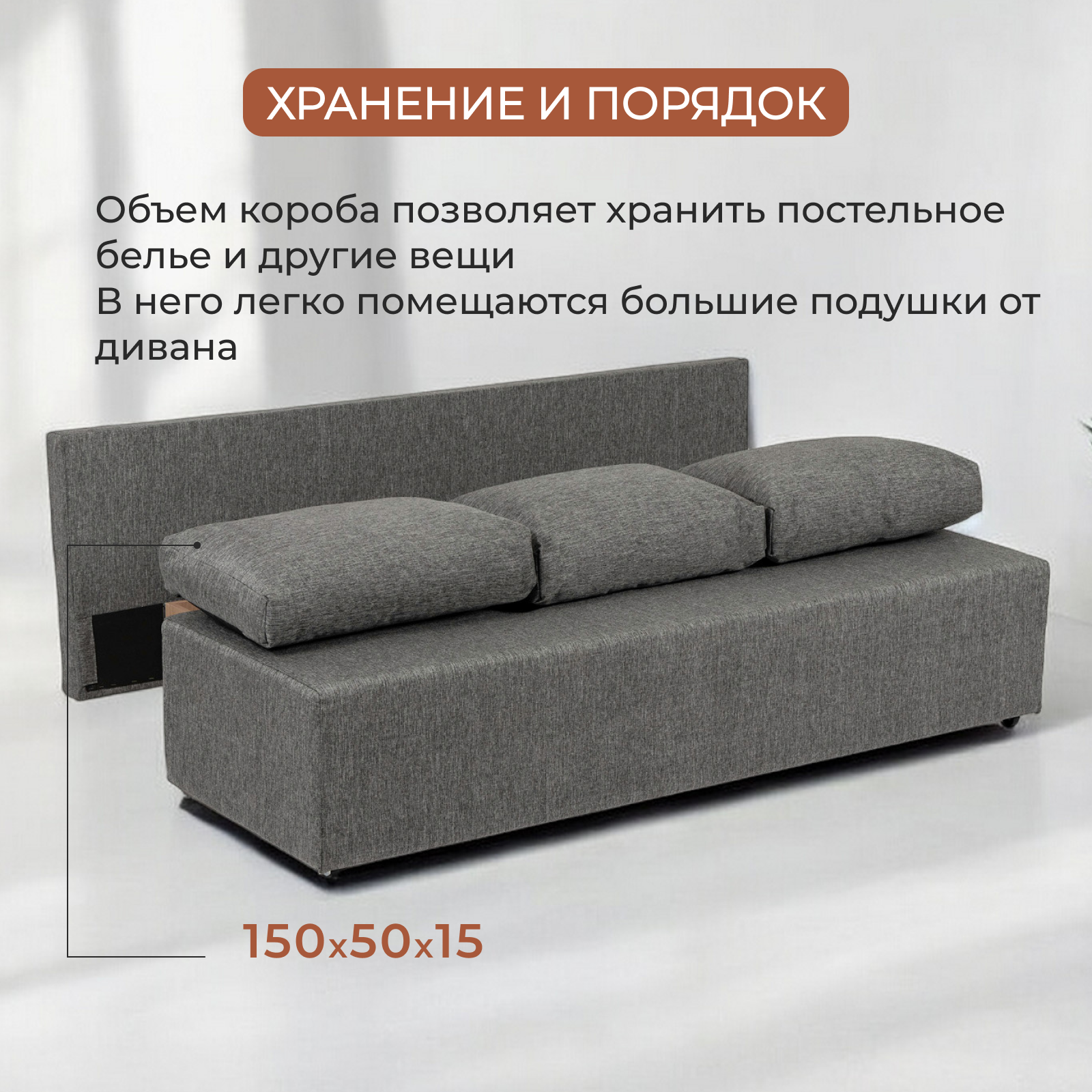 | Особенности | антивандальная обивка, без подлокотников, раскладная конструкция, съемные подушки, ящик для белья |