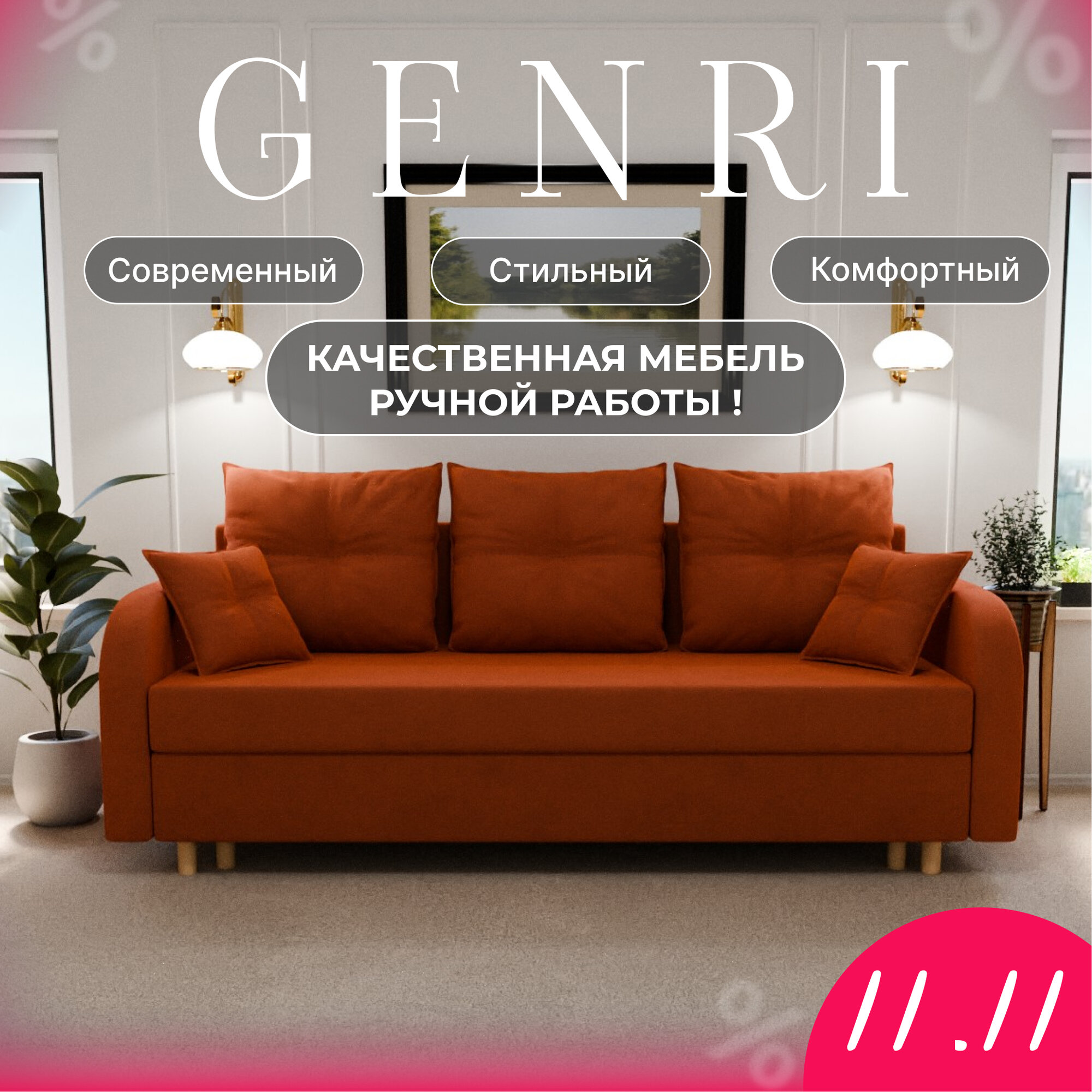 Диван-кровать "Genri" , YORCOM, ППУ, Велютта люкс 58, размеры 220х80х100, Оранжевый