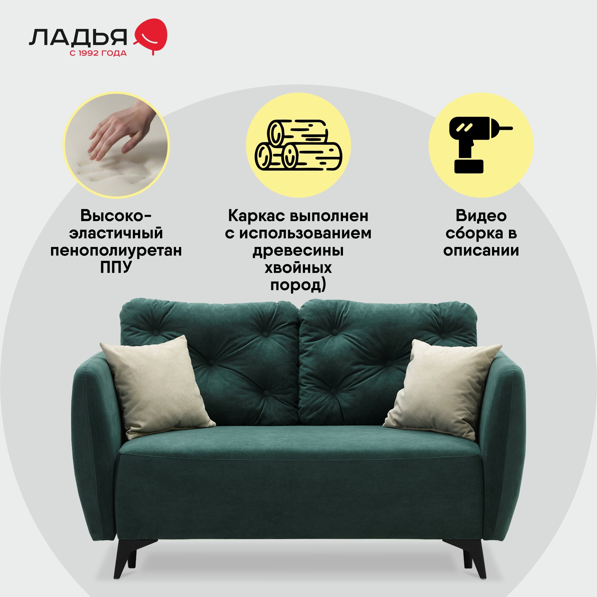 | Особенности | пружинный блок, раскладная конструкция, с подлокотниками, съемные подушки |