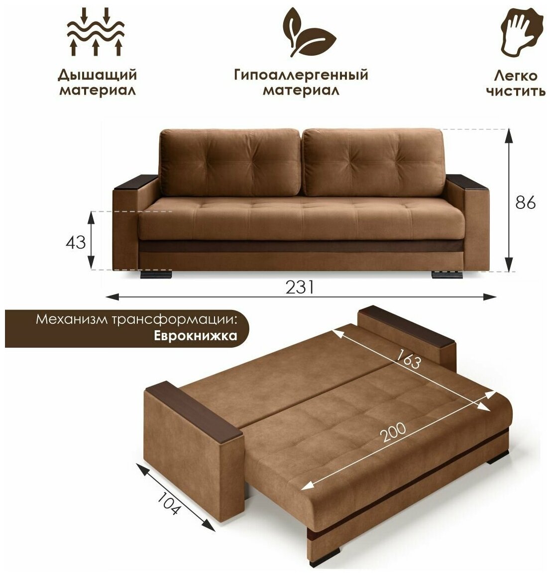 СохранитьДиван раскладной прямой, диван кровать Николетти, еврокнижка 231х104х86 см, спальное место 163х200 см, независимый пружинный блок, коричневый, АМИ мебель, Беларусь интересное:
