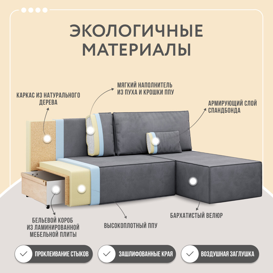 Диван-кровать раскладной угловой Корсо Лайт, еврокнижка, велюр, бежевый, 195х130х76