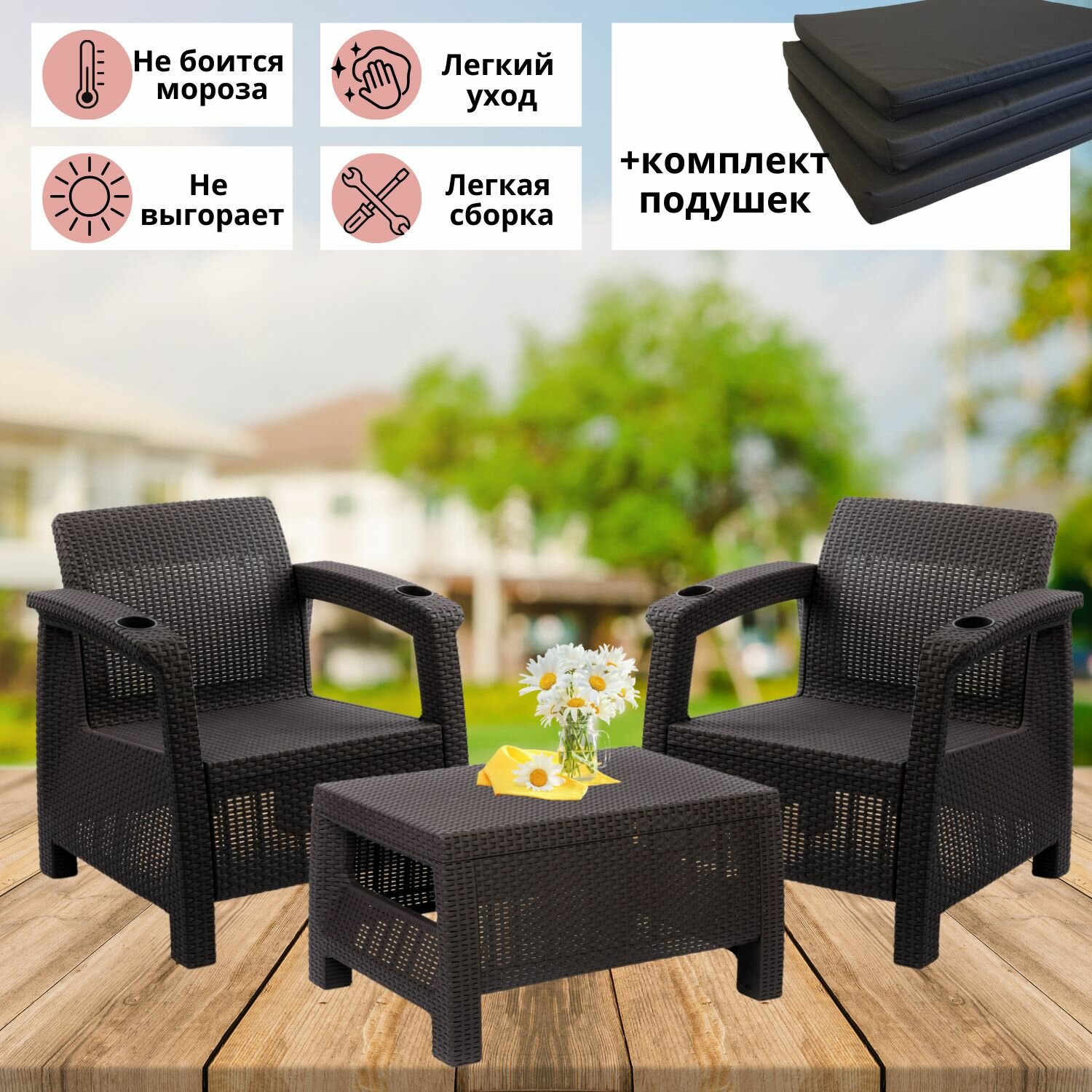 Купить Садовая мебель. Набор кофейный на 2 персоны (2 кресла + кофейный столик), искуственный ротанг, мокко с черными подушками