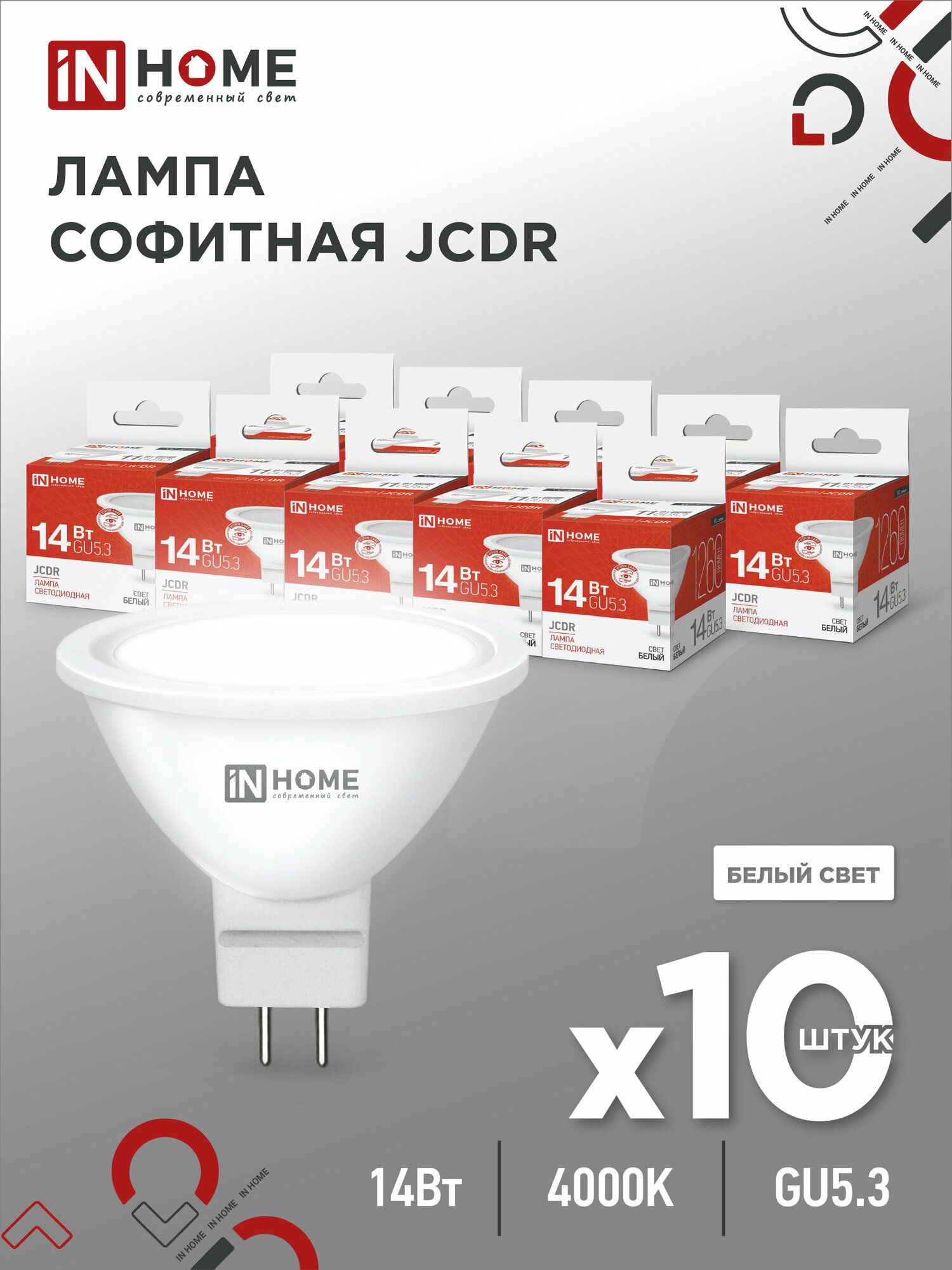 Лампа светодиодная GU5.3, набор 10 шт, нейтральный белый свет 4000К, 1260 Лм / 14 Вт, 230 В, IN HOME LED-JCDR-VC