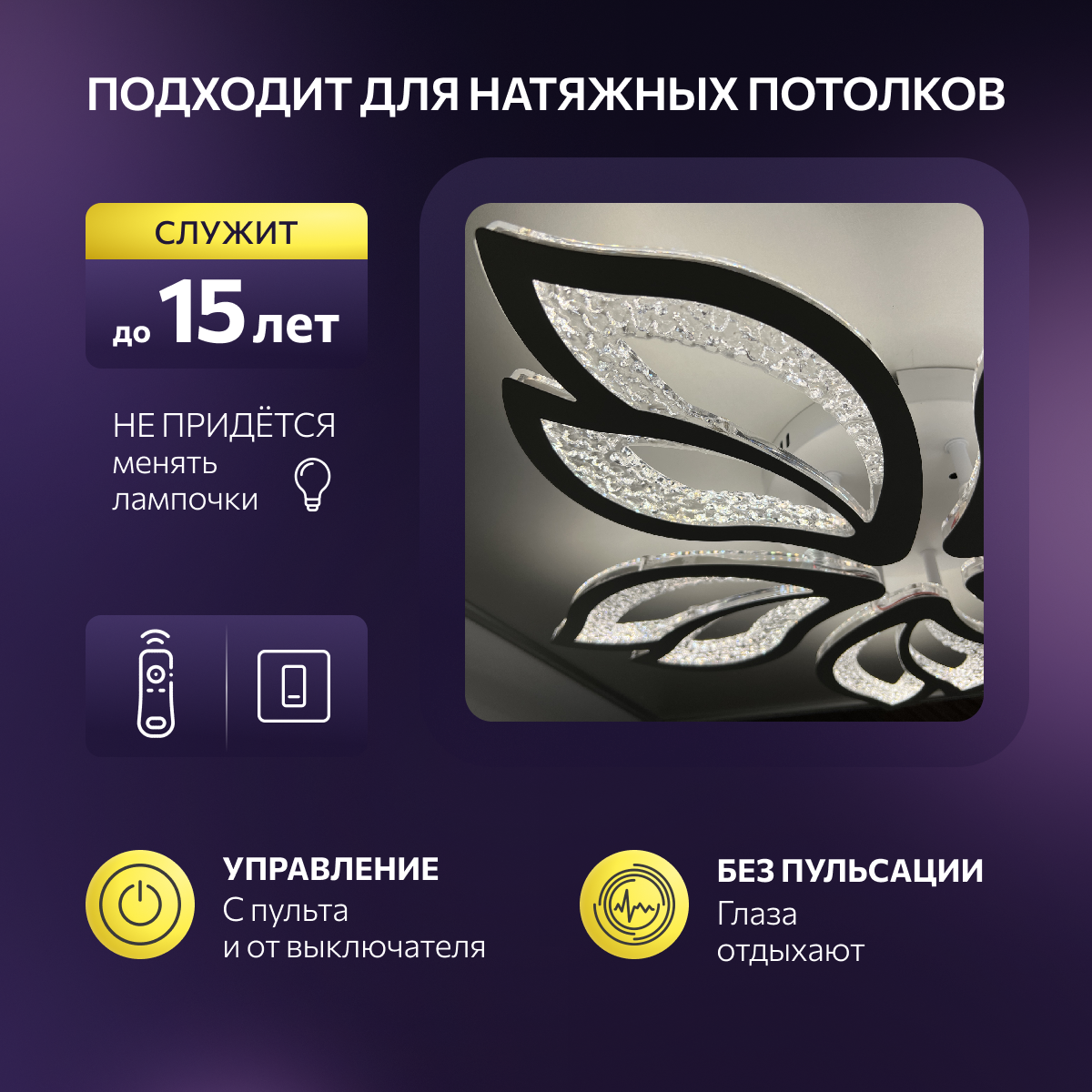| Особенности | крепление в комплекте / лампы в комплекте / прозрачный плафон / режим ночника |
