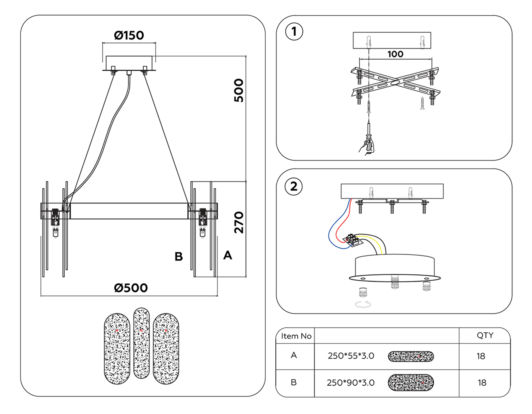 Подвесной светодиодный светильник с пультом управления FL5368/2+1 BK черный 47W 3000K-6400K D480*1200 (ПДУ ИК)