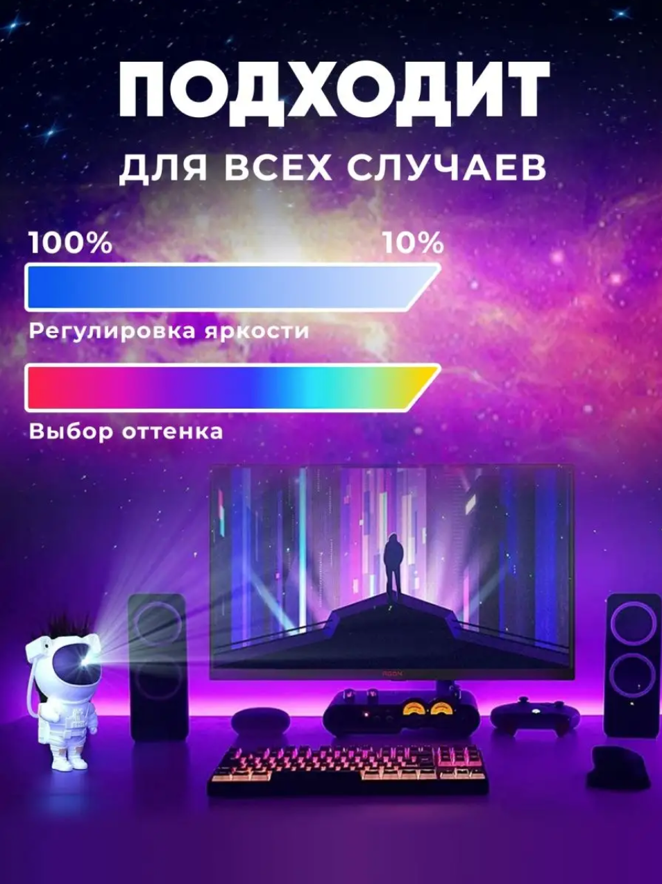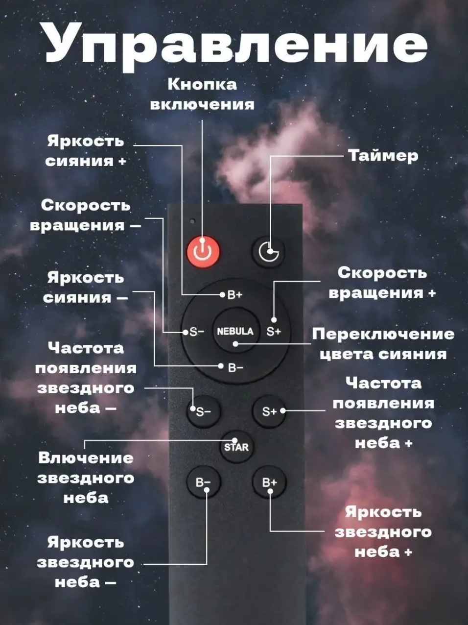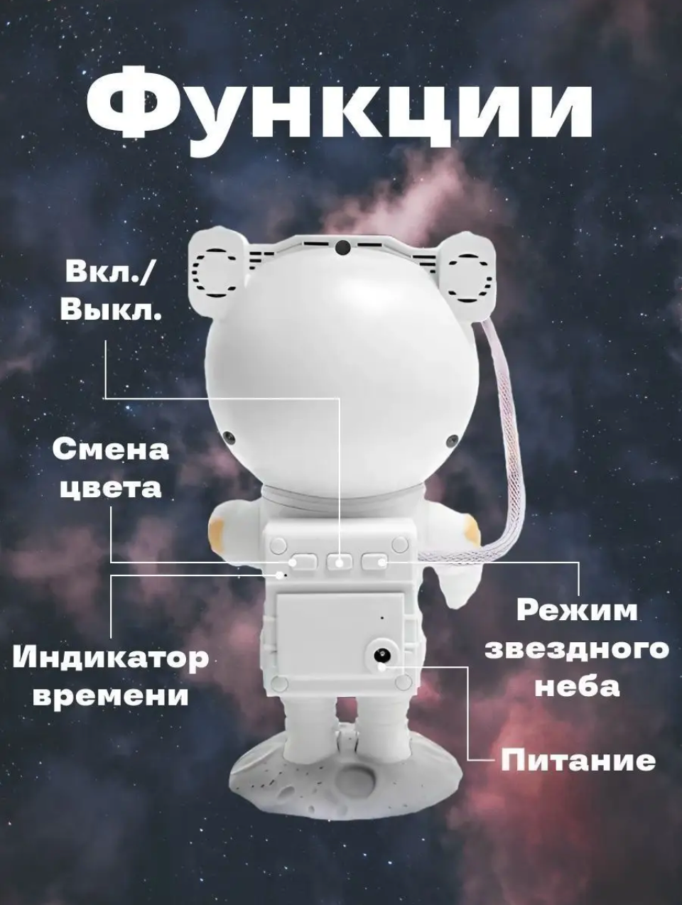 | Комплектация | Светильник-проектор звездного неба, Космонавт, пуль ДУ , Шнур USB, Инструкция |