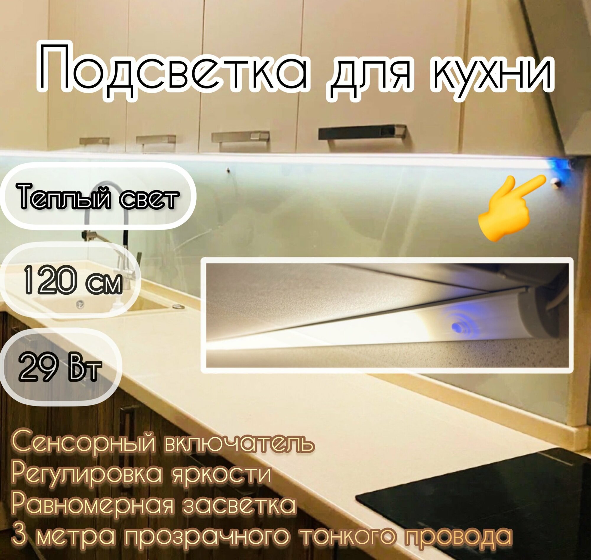 СохранитьПодсветка для кухни 120 см, сенсорная с возможностью регулировки яркости, Мощность 29Вт. Теплый белый 3000К. Комплект интересное:
