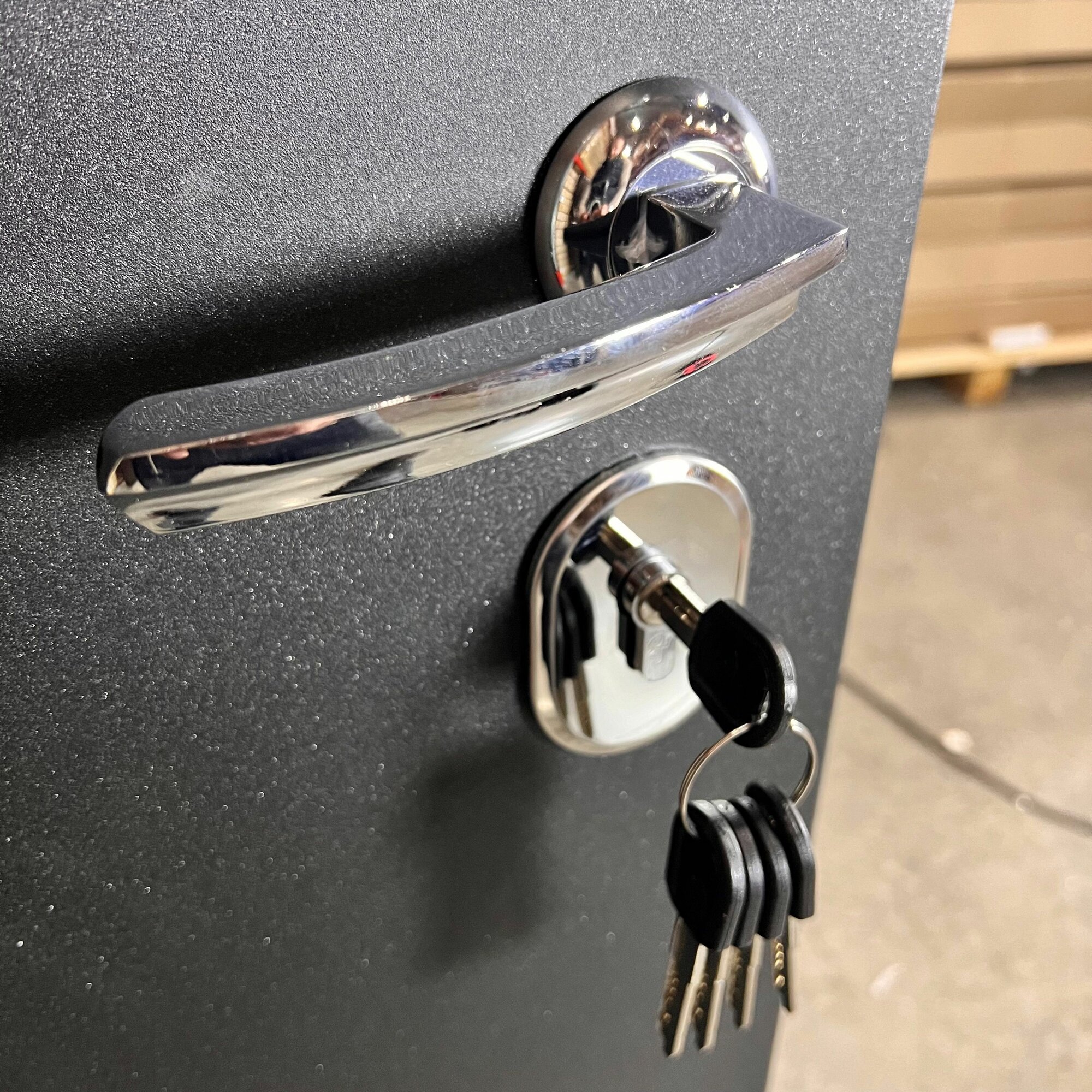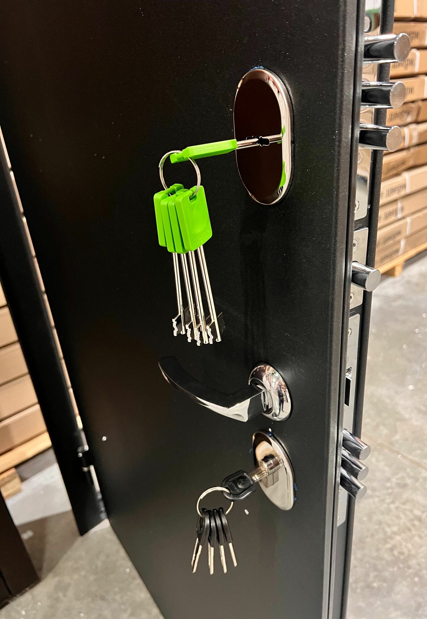 | Комплектация двери | броненакладка / глазок / задвижка / замок / петли / противосъемные штыри / ручки / эксцентрик |
