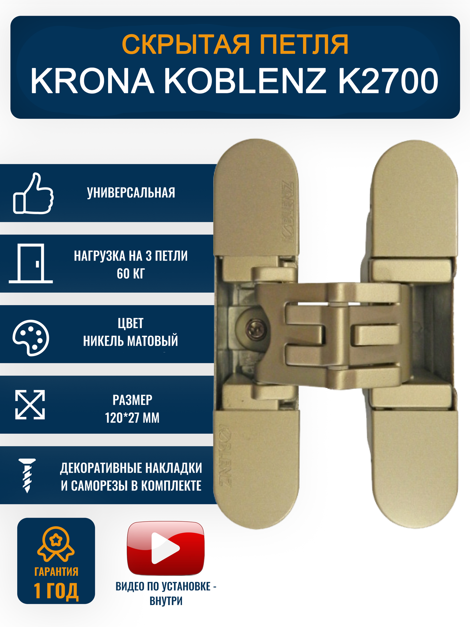 Петли дверные скрытые KRONA KOBLENZ K2700 NS 1 шт, никель матовый интересное: