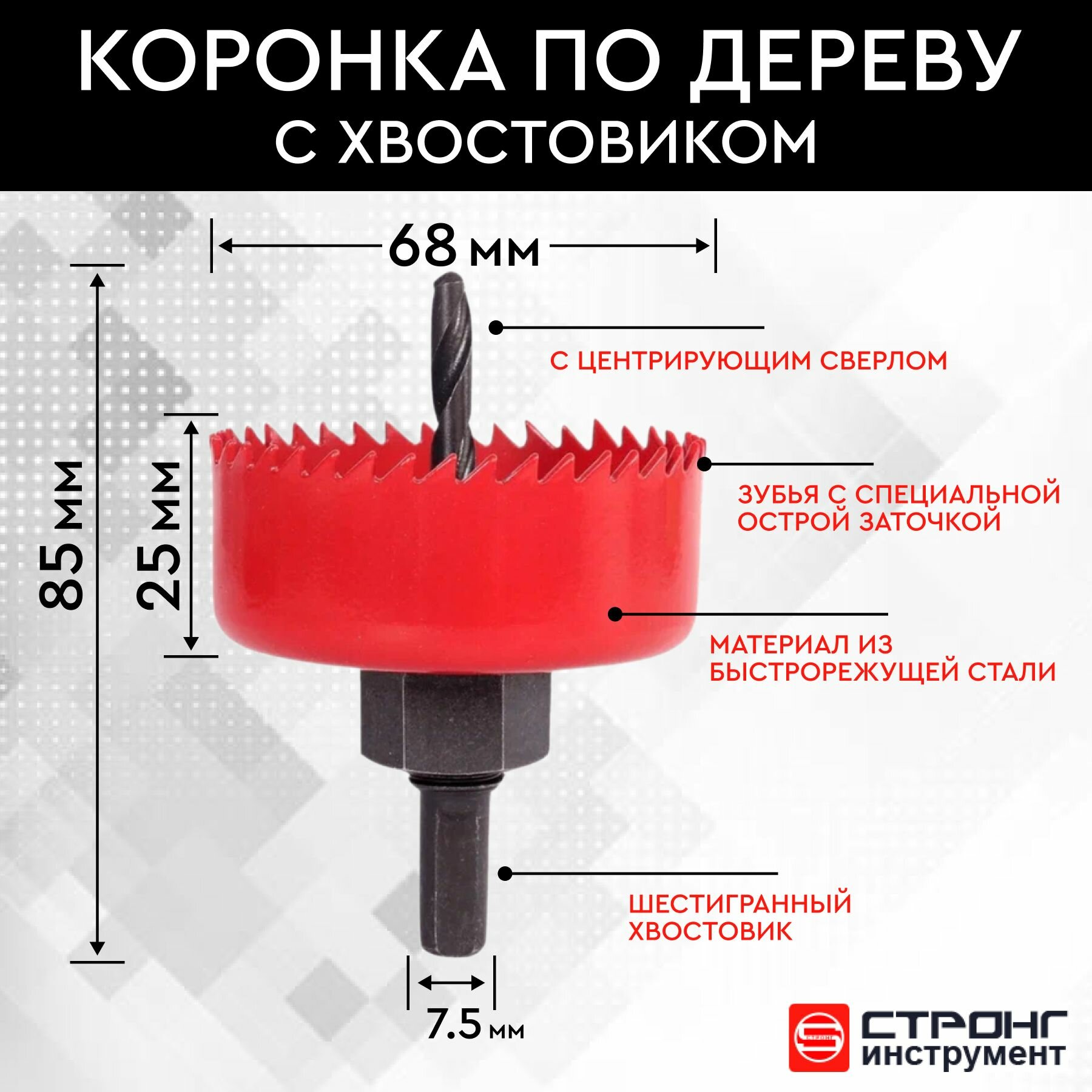 Коронка по дереву с хвостовиком 68 мм, 2 предмета, Стронг СТK-048006068, 1шт. интересное: