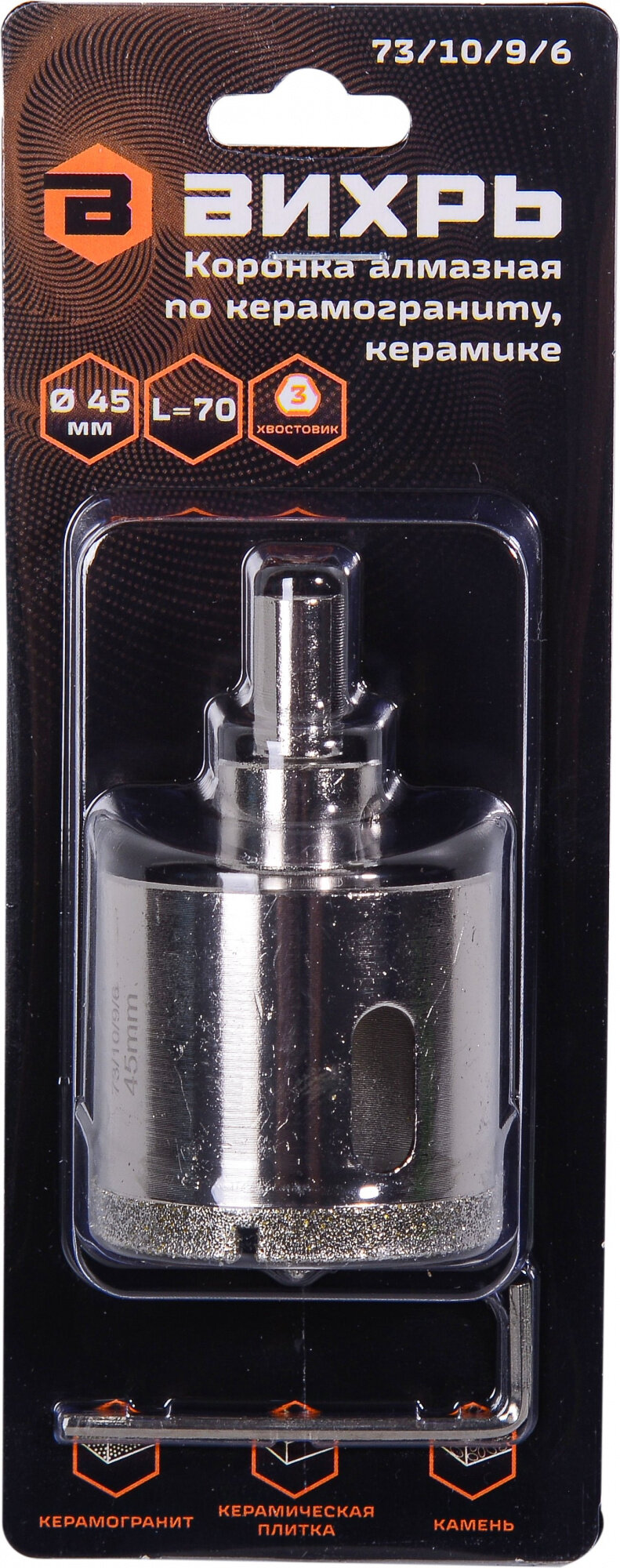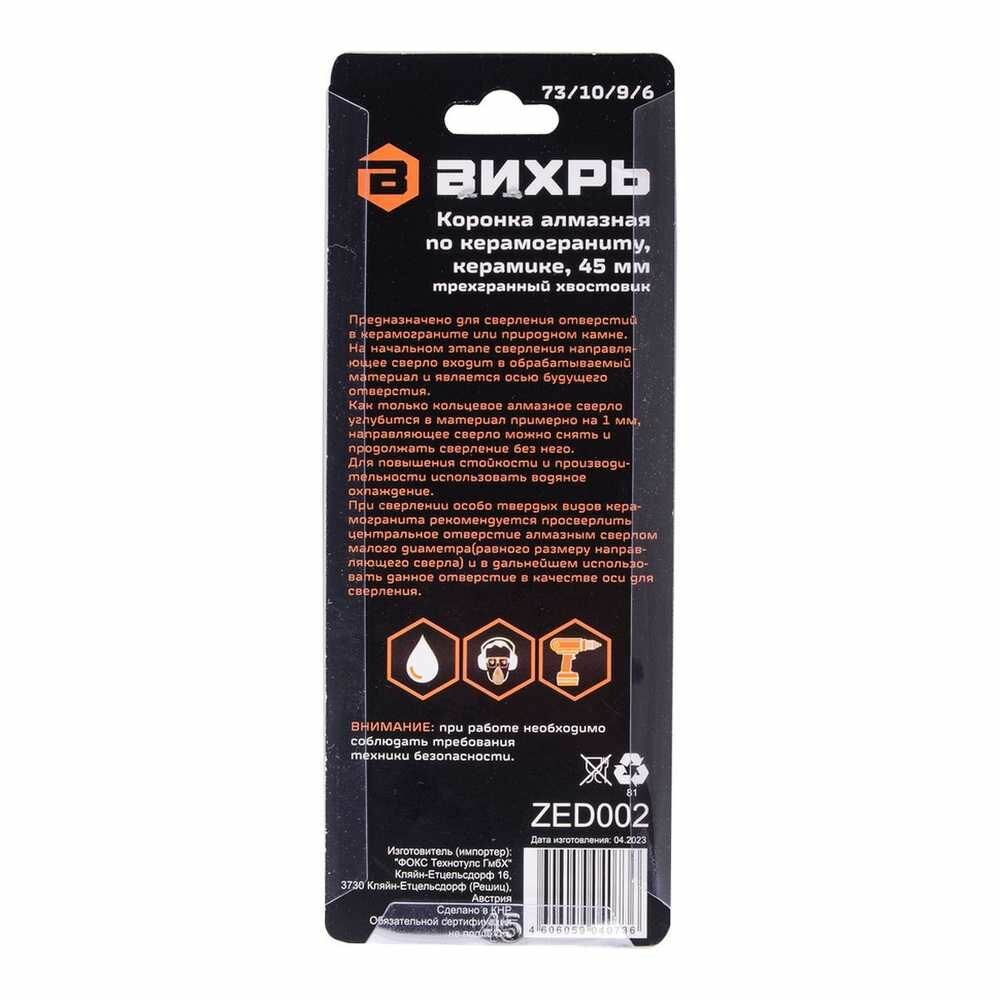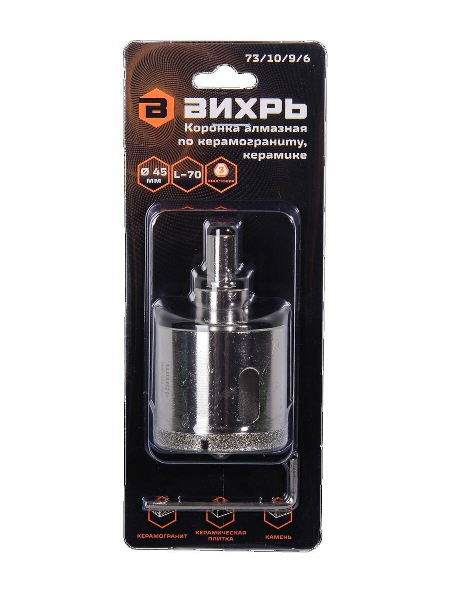 Коронка алмазная Вихрь по керамограниту/керамике 45 мм, 73/10/9/6