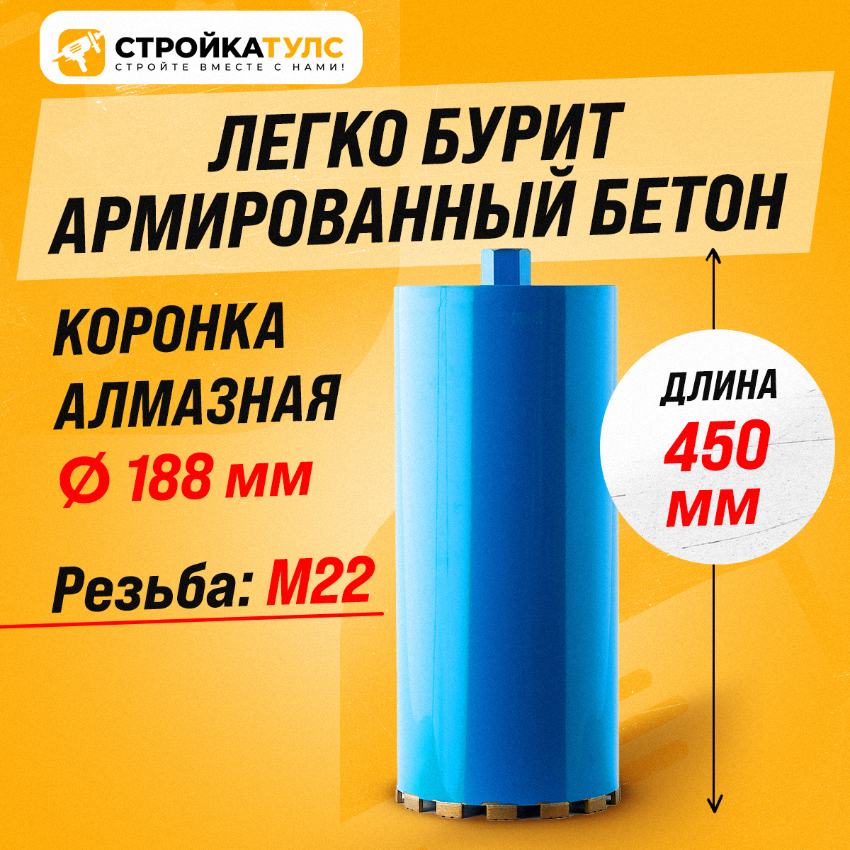 Купить Коронка алмазная М22 188*450 мм по бетону, кирпичу для сухого и мокрого бурения