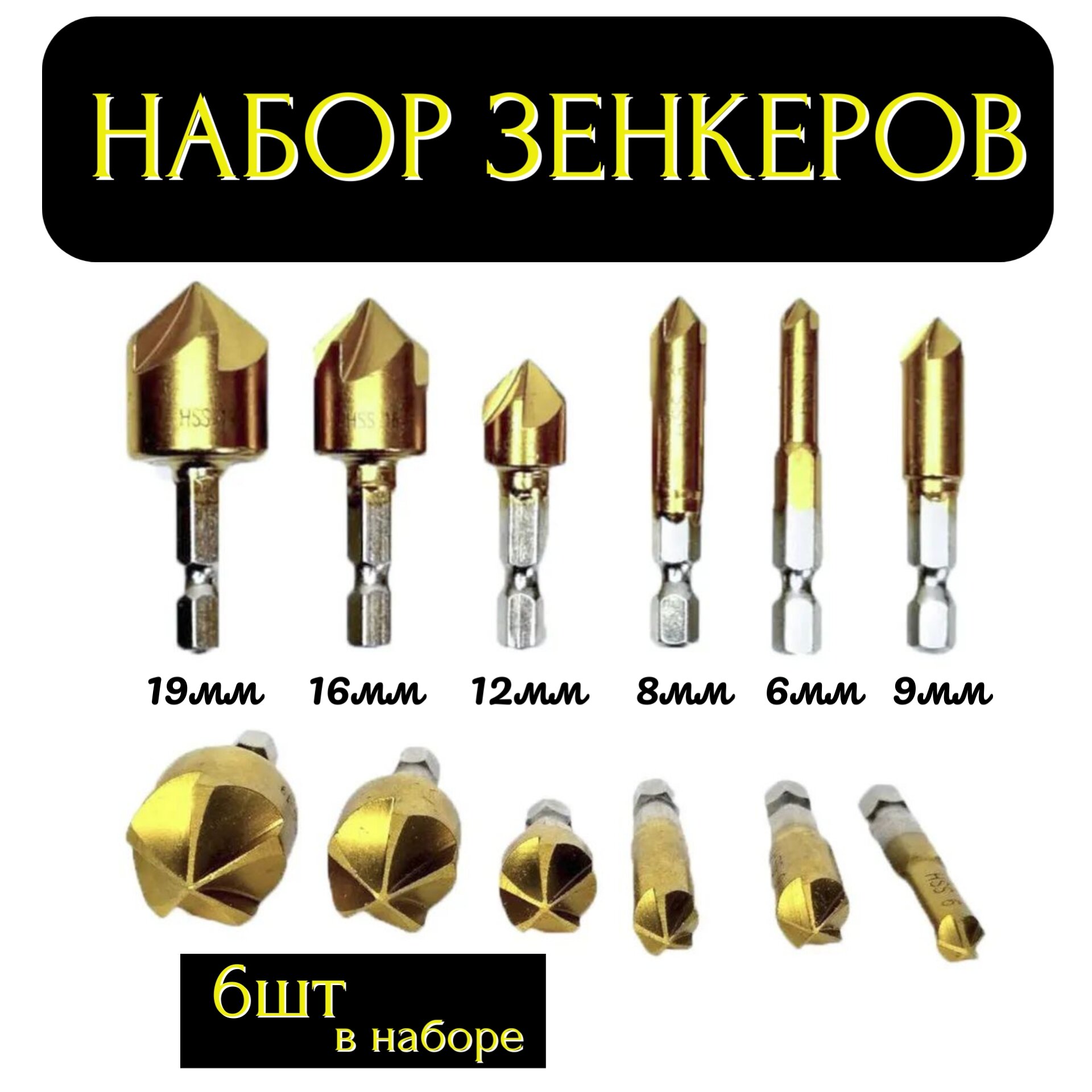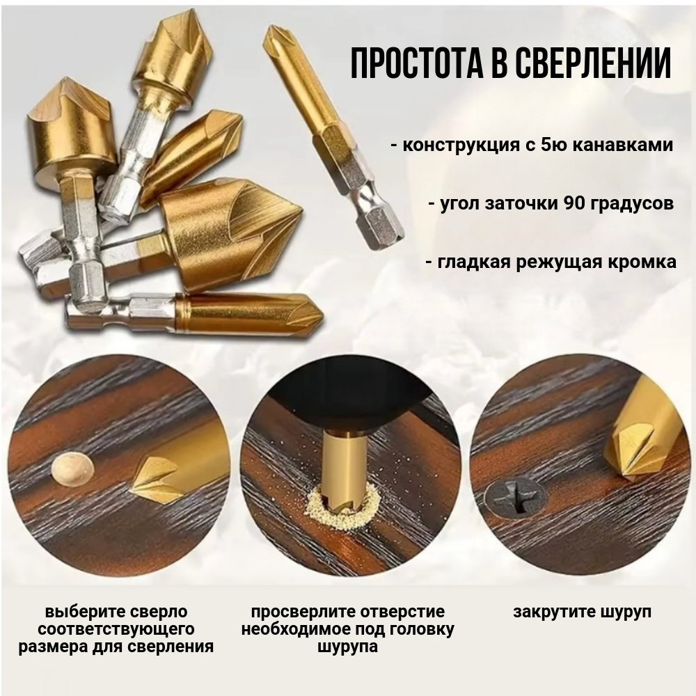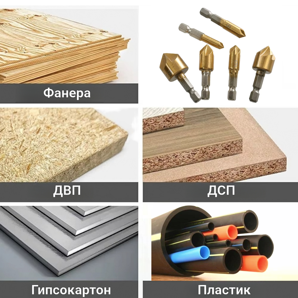 Набор зенковок по дереву, пластику и алюминию (6шт. - 6, 8, 9, 12, 16 и 19мм) интересное: