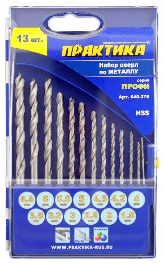 Ниже Вы можете прочитать отзывы на Набор сверл по металлу ПРАКТИКА "Профи" 13шт. 1,5-6,5 + 3,2, 4,2 мм про кассета (640-278), ознакомится с подробными характеристиками, посмотреть интересные обзоры и фотографии на Набор сверл по металлу ПРАКТИКА "Профи" 13шт. 1,5-6,5 + 3,2, 4,2 мм про кассета (640-278).
