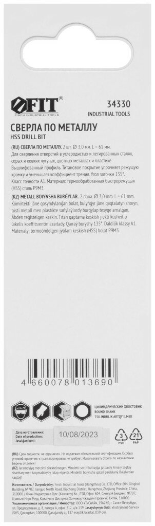 Сверло по металлу FIT HSS 3, 3 мм, титановое покрытие, 2шт