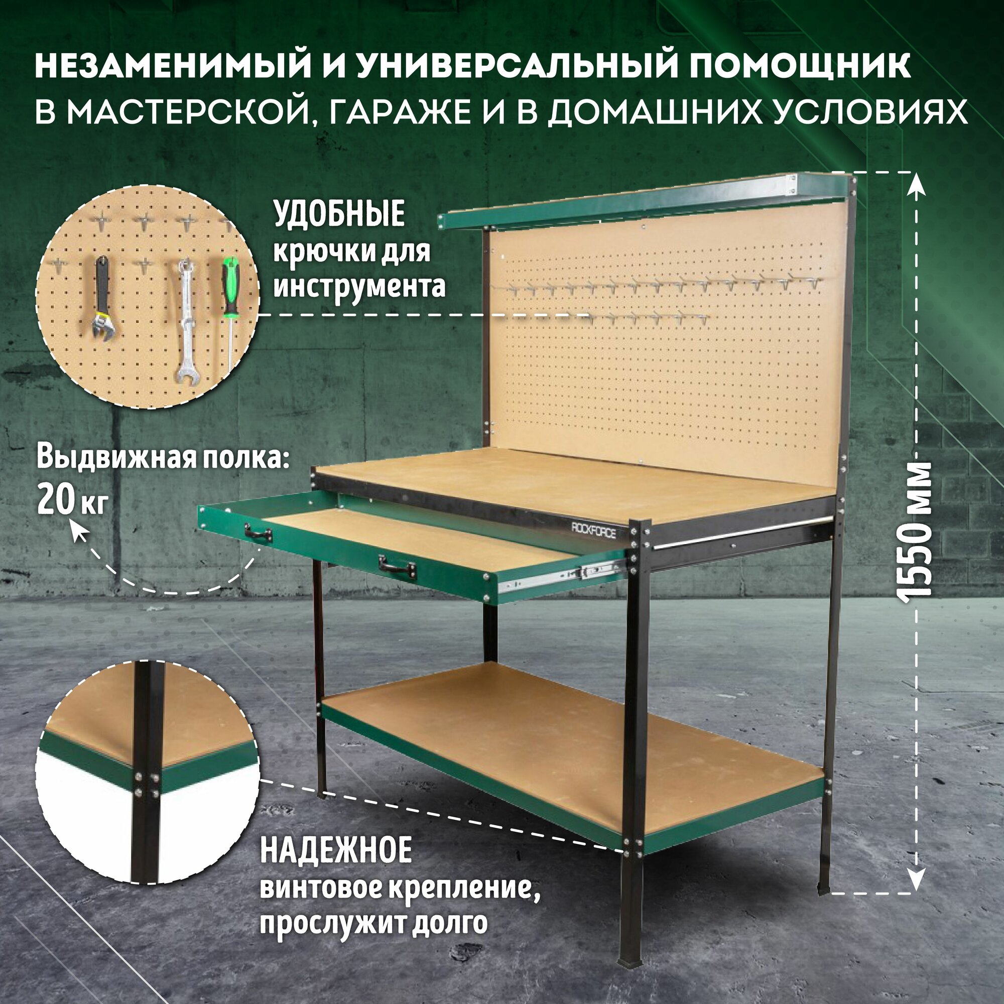 Верстак слесарный (1550х1200х600мм,600х1200-столешница,нагрузка:120кг-столешница,80кг-полка,20кг-выдвиж.полка) RockForce##Rock FORCE RF-01Y0320 интересное: