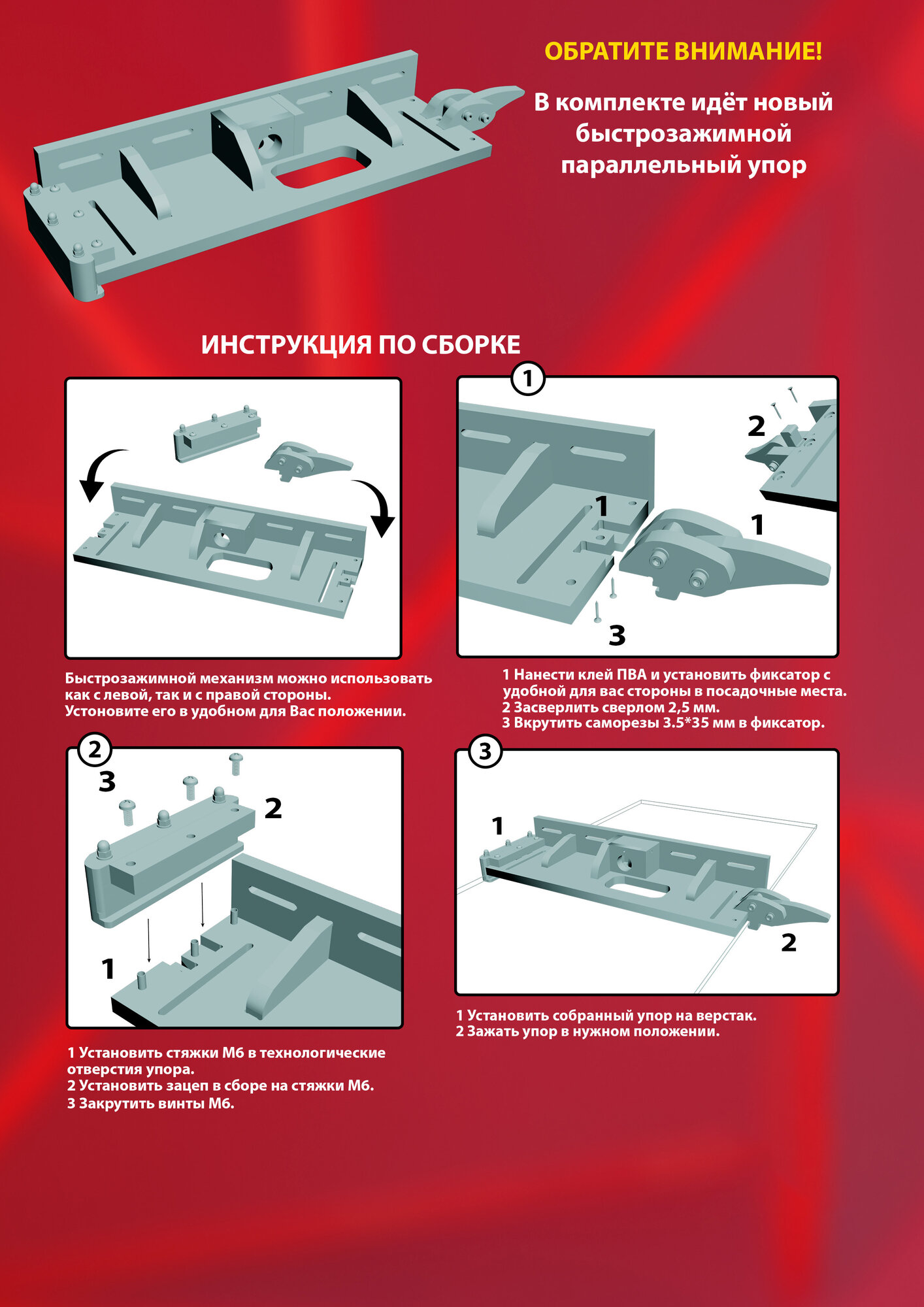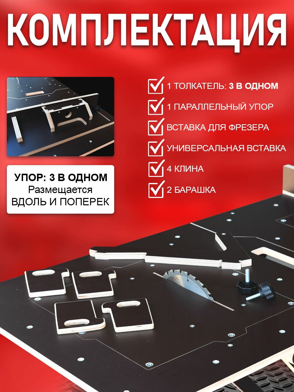 | Подробная комплектация | Верстак складной, упор передвижной, клинья для фиксации 4 штуки, вкладыши 2 штуки |