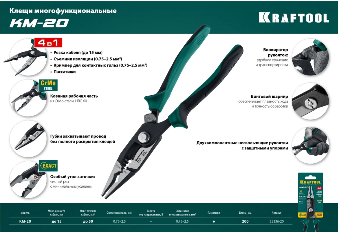 Клещи KRAFTOOL KM-20, резка, d 15мм, зачистка 0.75 - 2.5 мм2, многофункциональные (23336-20) интересное: