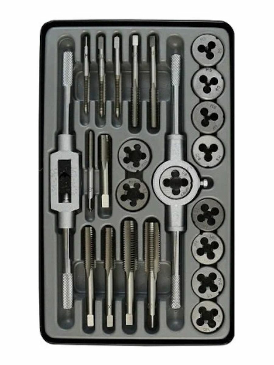 | Подробная комплектация | 7 шт.: Плашка: М3х0,5; М4х0,7; М5х0,8; М6х1,0; М8х1,25; М10х1,5; М12x1,25 мм; 7 шт.: Метчик однопроходной: М3х0,5; М4х0,7; М5х0,8; М6х1,0; М8х1,25; М10х1,5; М12x1,25 мм; 1 шт.: Ключ для плашек 25 x9; 1 шт.: Ключ для метчиков М3-М12; 1 шт.: Ключ быстрозажимной для метчиков Т-образный М3-М6; 1 шт.: Ключ быстрозажимной для метчиков Т-образный М5-М12; 1 шт.: Резьбомер 0,5-2,5 мм; 1 шт.: Щётка; 1 шт.: Отвертка; Футляр. |