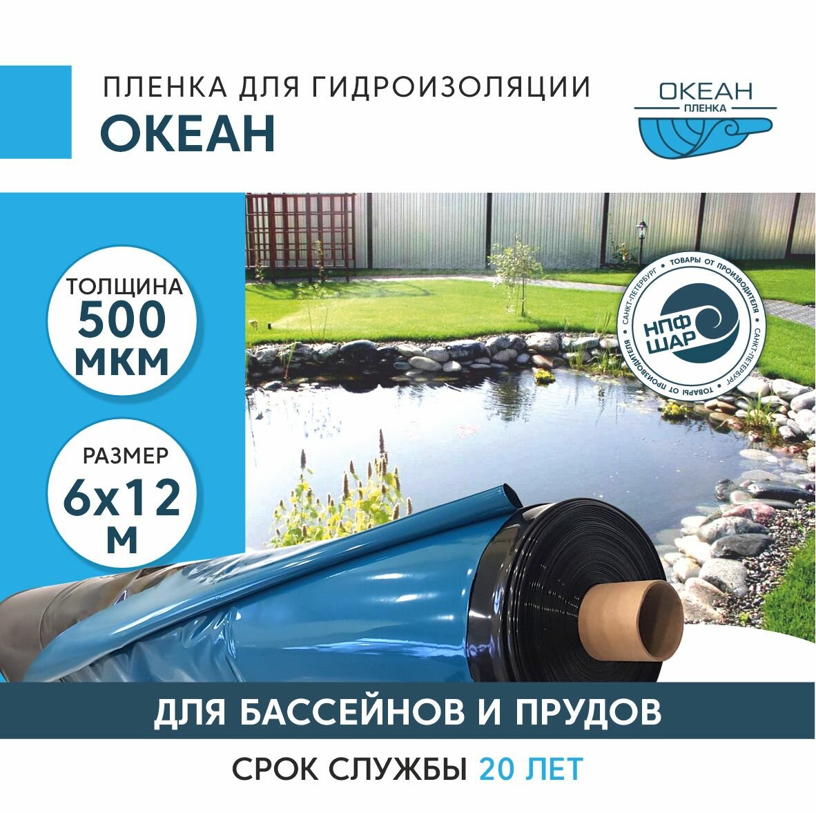 Пленка океан для гидроизоляции, для бассейна, пруда и водоема 6x20 м, 500 мкм, полиэтиленовая