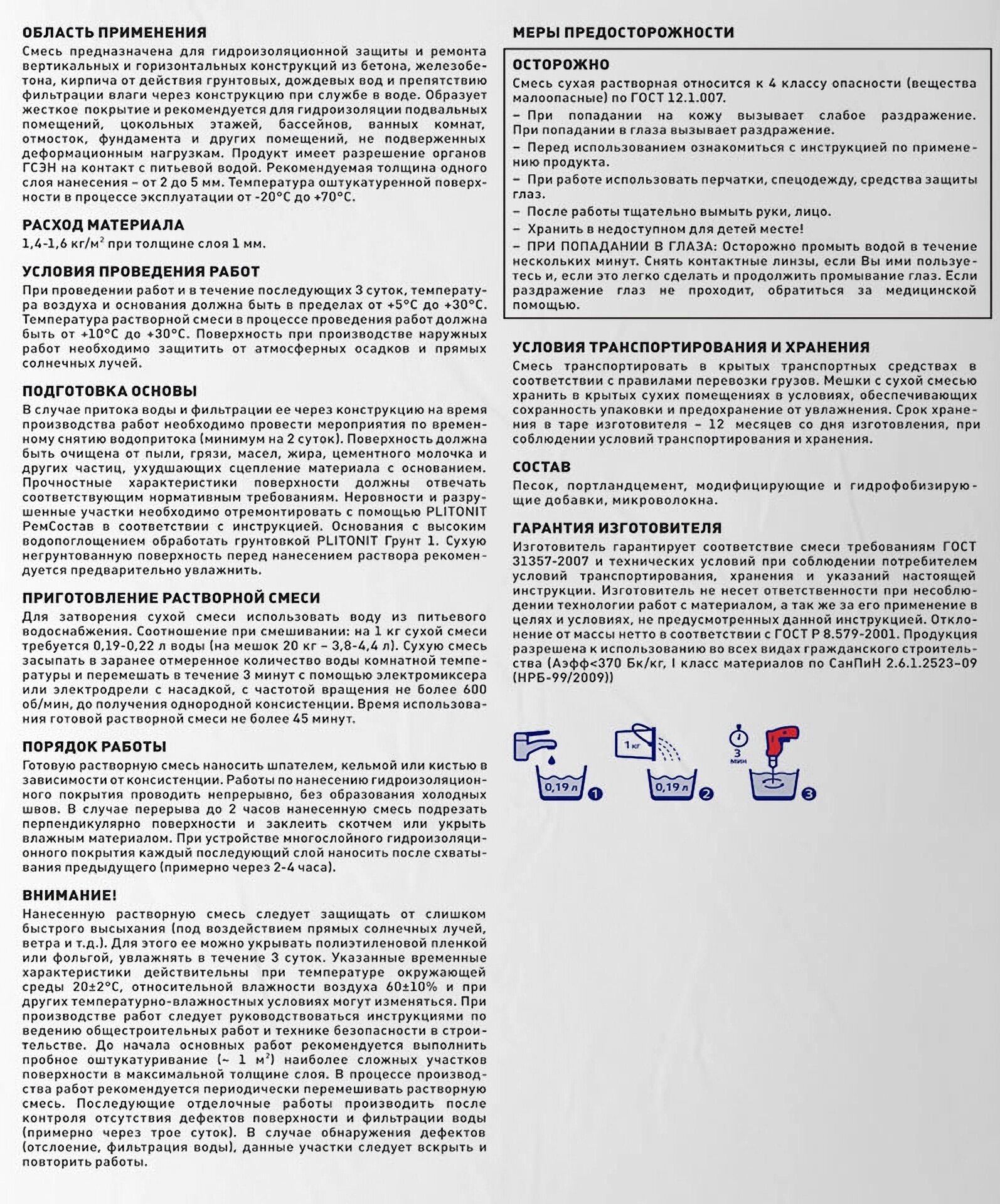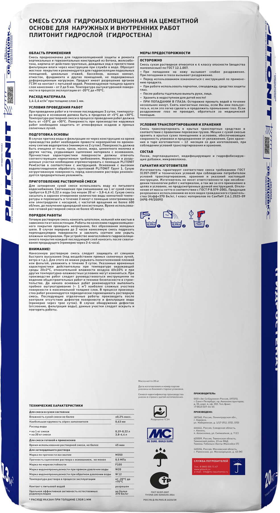 | Дополнительная информация | Гидроизоляция ПЛИТОНИТ ГидроСлой жесткая обмазочная цементная 5кг |