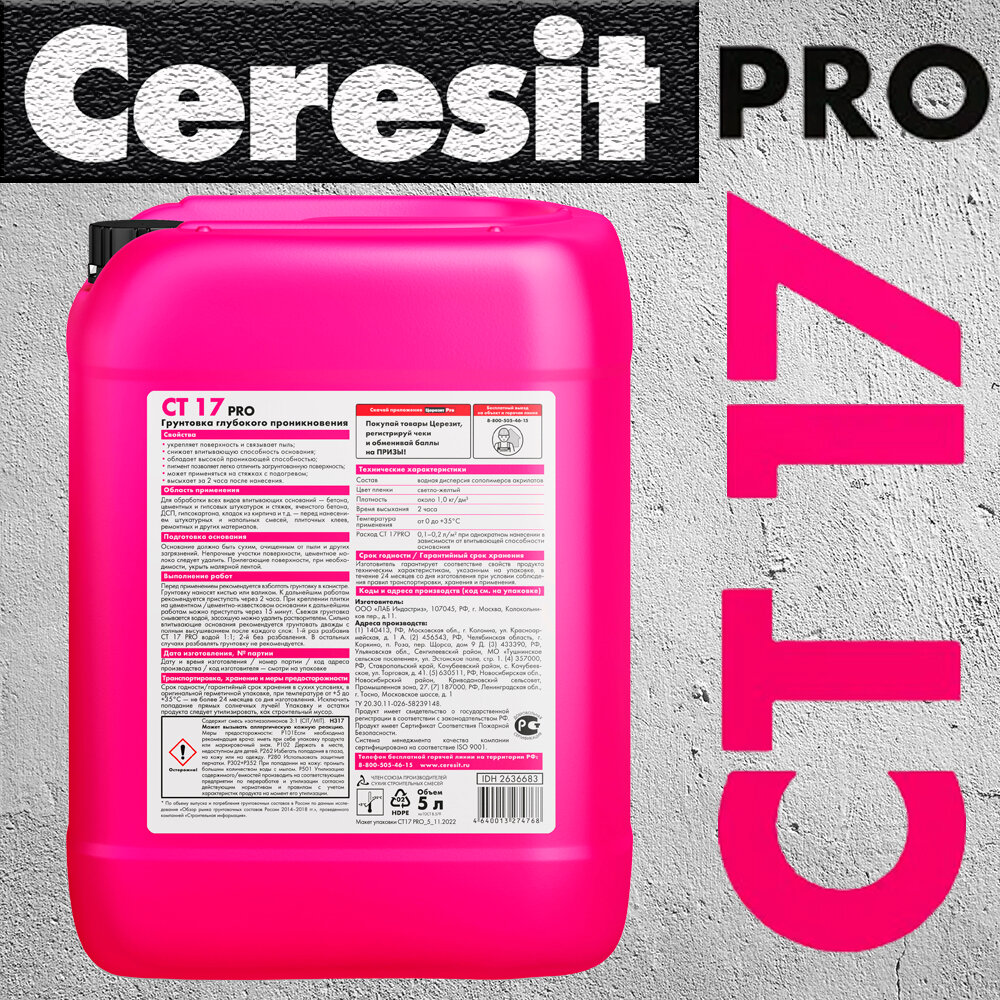 CERESIT CT 17 PRO грунтовка глубокого проникновения для наружных и внутренних работ (5л)