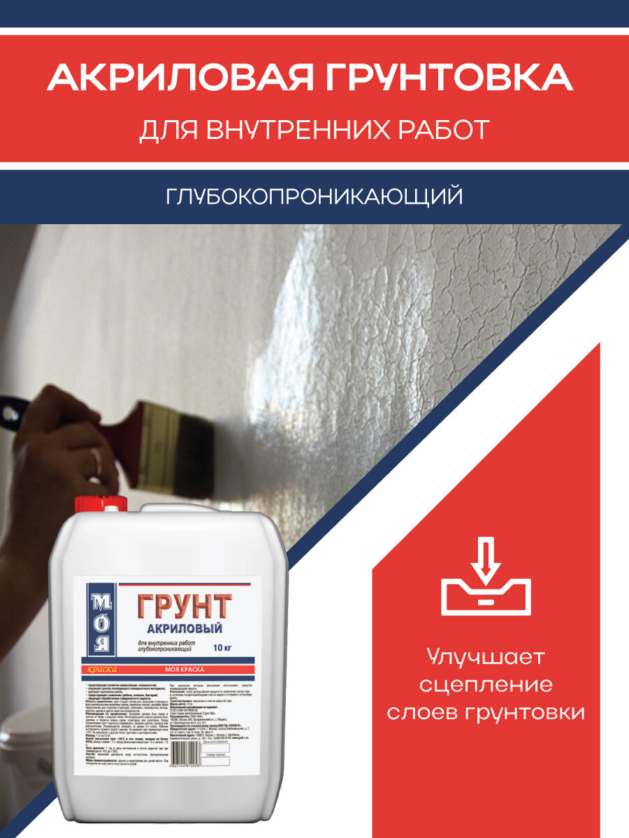 Грунтовка Акриловая Моя Краска 10кг Глубокопроникающая для Внутренних Работ.