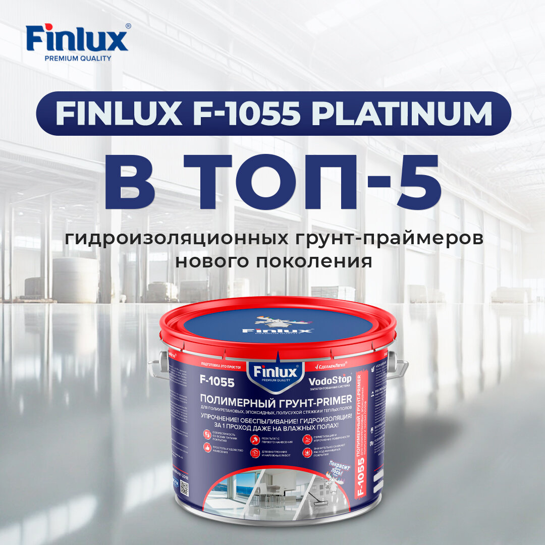 Полимерный Грунт праймер для полиуретановых, эпоксидных, полусухой стяжки и тёплых полов Finlux F-1055 с эффектом VODOSTOP, бесцветный, 10 кв. м. интересное: