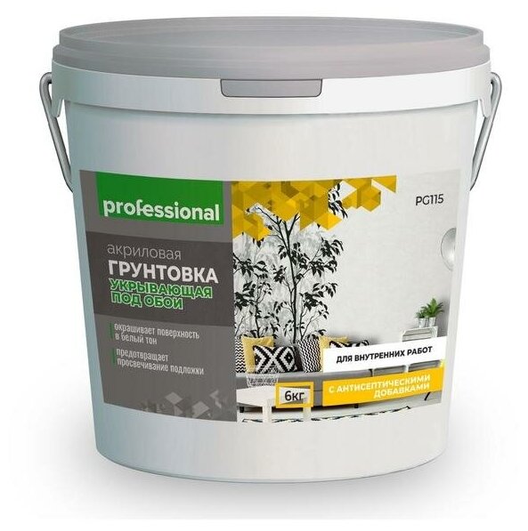 Грунтовка акриловая для стен под обои PROFESSIONAL укрывающая белая с антисептиком без запаха для внутренних работ 6кг