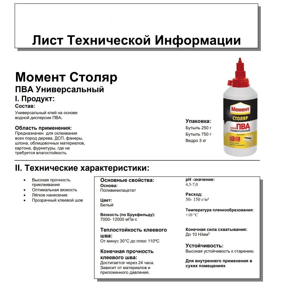 | Дополнительная информация | белый, после высыхания прозрачный; термостойкий; теплостойкость клеевого шва: от минус 30°C до плюс 110ºC; pH -значение: 4,5-7,0; расход 50- 150 г/м² |