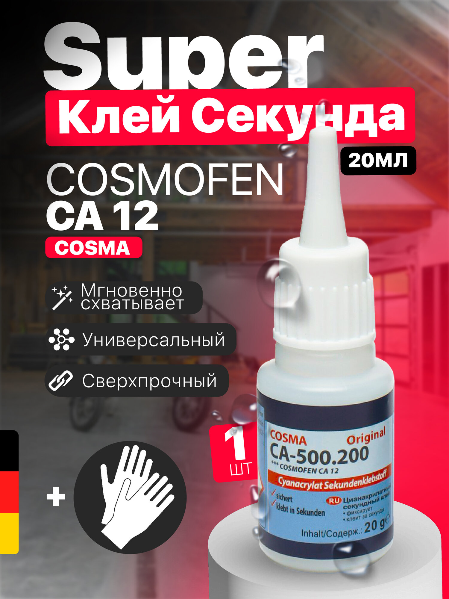 Клей цианоакрилатный секундный 20гр COSMO CA-500.200 (COSMOFEN CA 12) FL95, 1 шт.