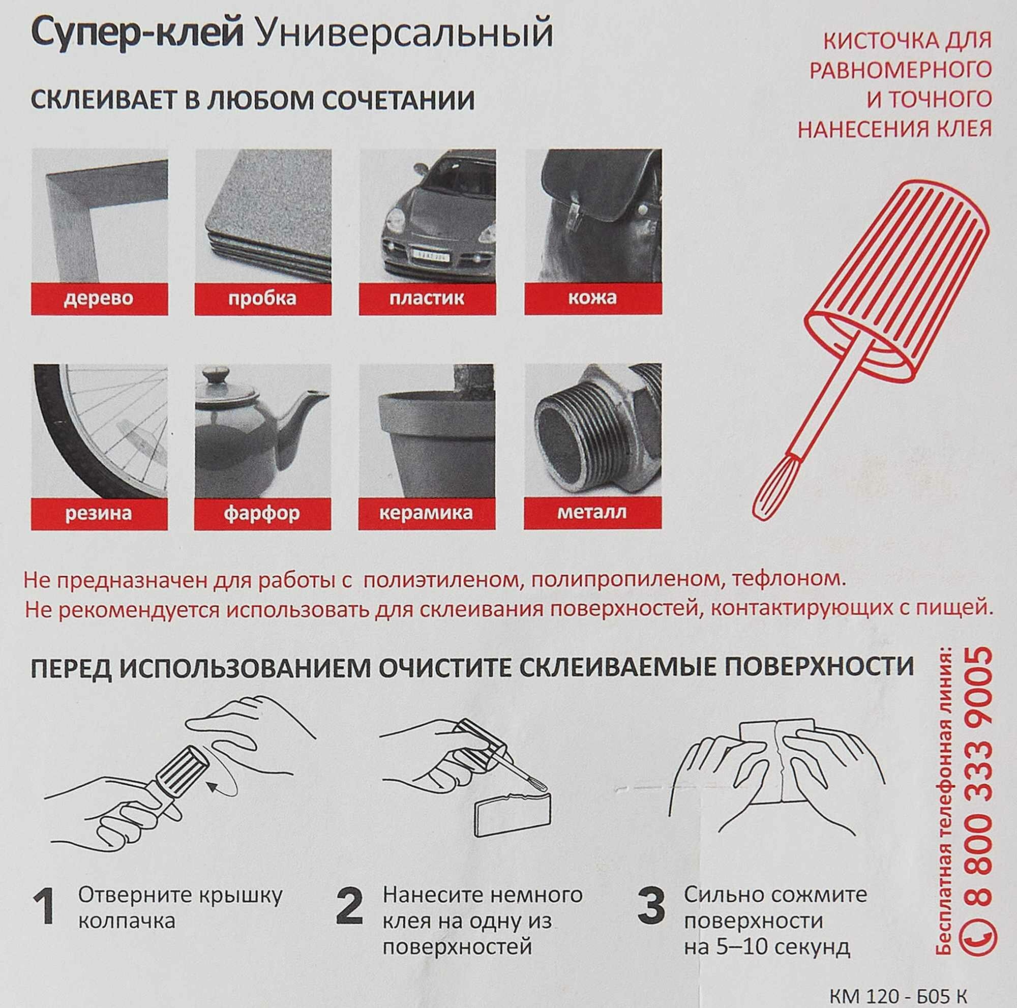 | Дополнительная информация | избегать вдыхания паров, использовать защитные перчатки; не предназначен для работ с полиэтиленом, полипропиленом, тефлоном; не рекомендуется для склеивания поверхностей, контактирующих с пищей |