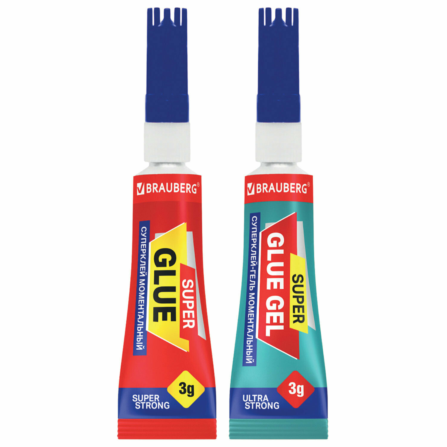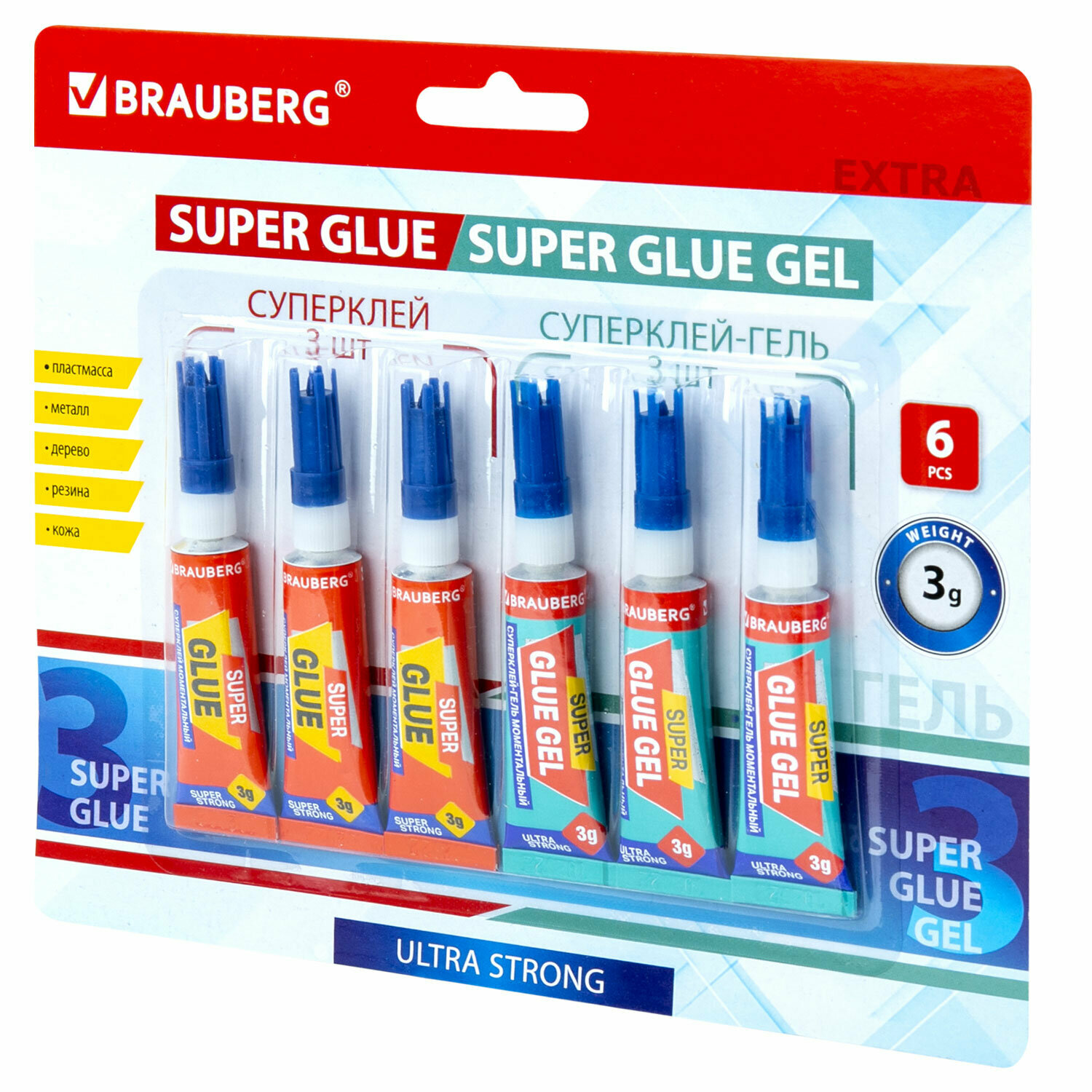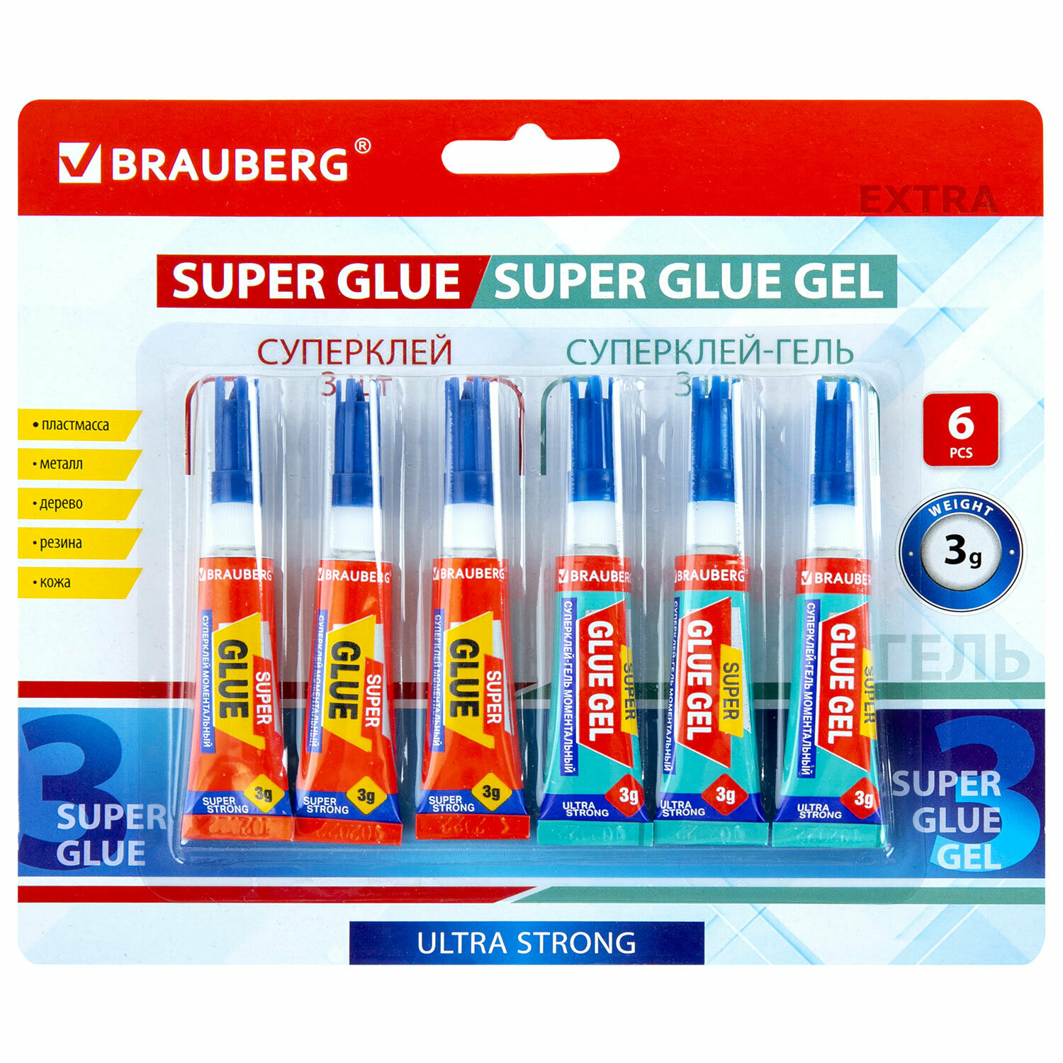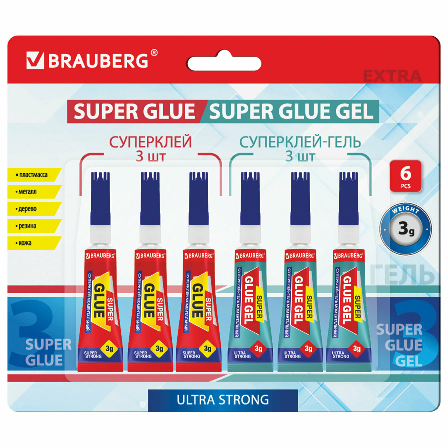 Клей-Гель моментальный 3 шт. по 3 г + Суперклей 3 шт. по 3 г, набор 6 тюбиков, BRAUBERG EXTRA, 608108