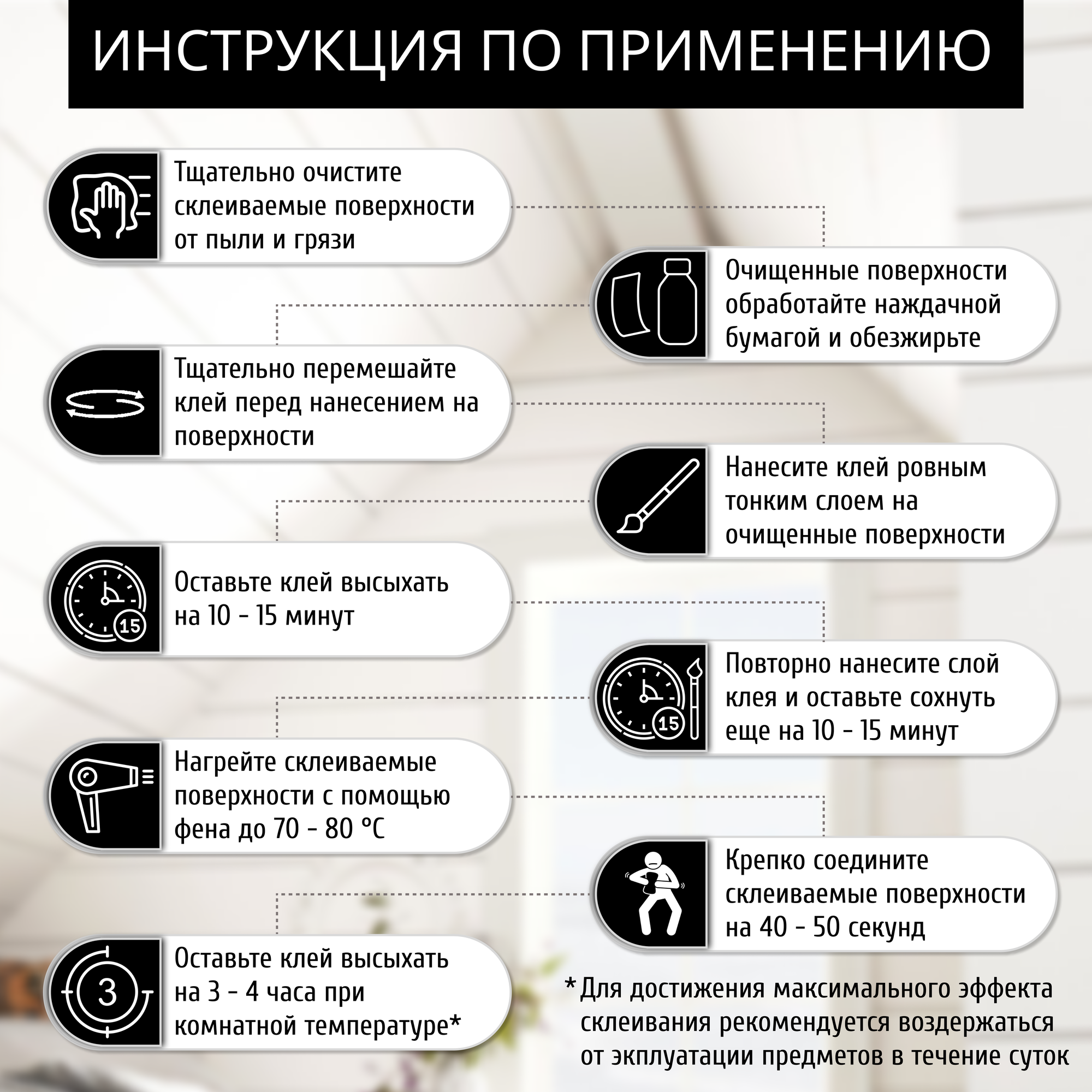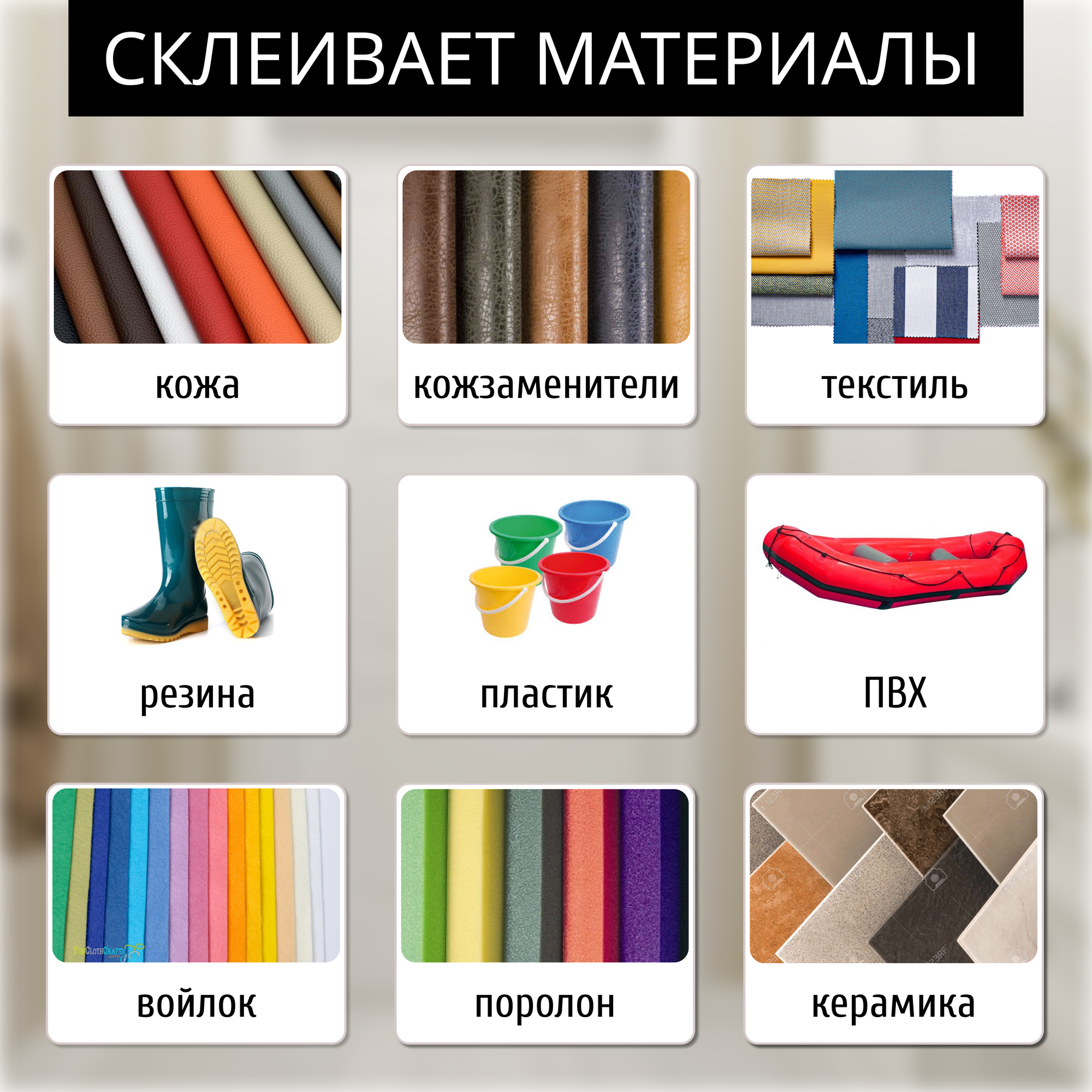 | Материалы для склеивания | ПВХ / дерево / керамика / кожа / металл / пластик / полиуретан / резина / стекло / ткань / фарфор |