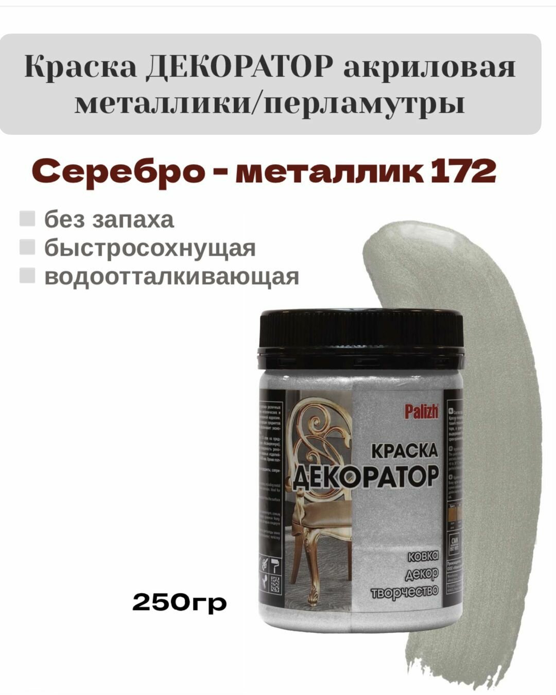 Краска Декоратор акриловая быстросохнущая Palizh перламутр Серебро 0,25кг