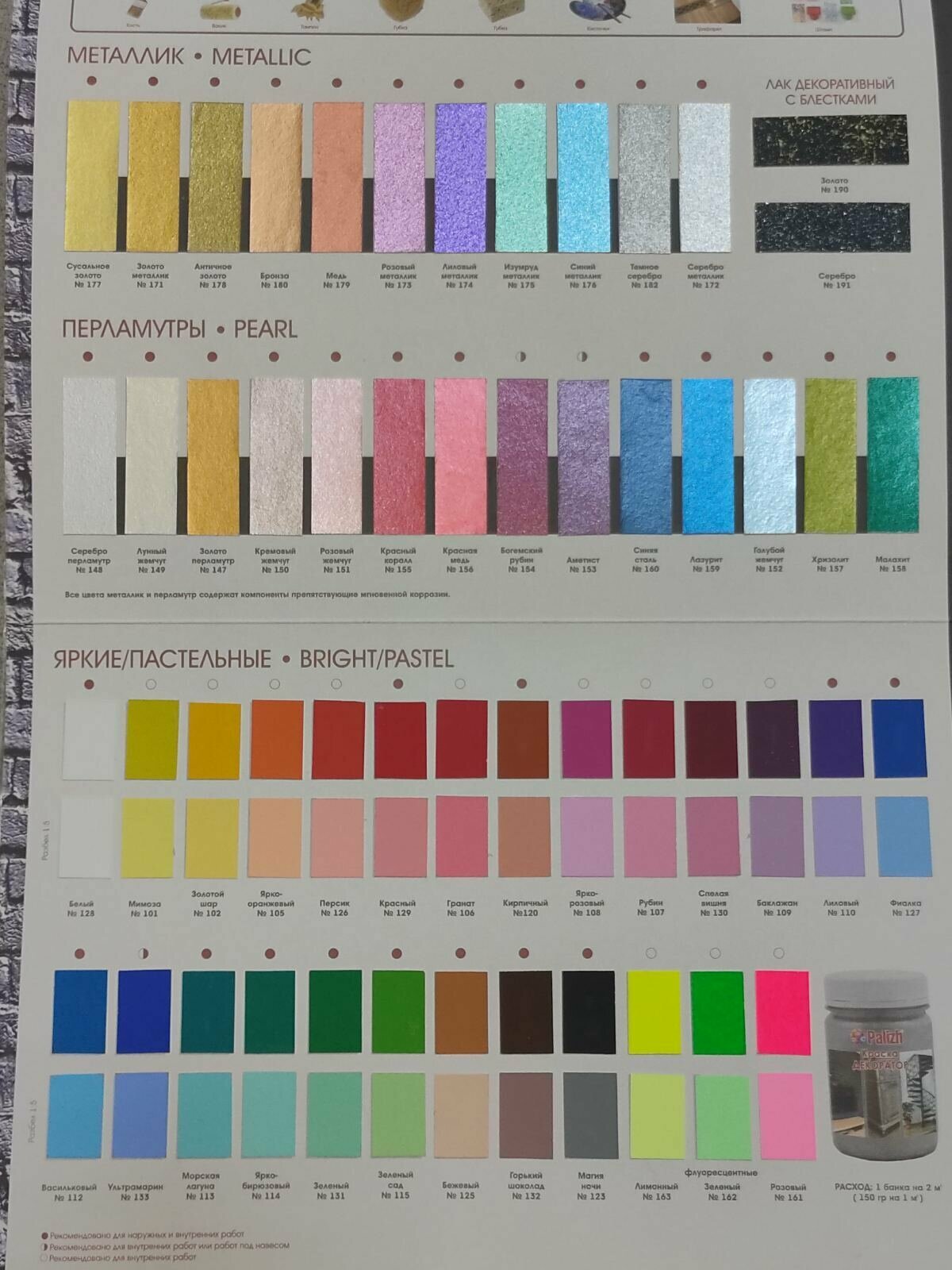 | Дополнительная информация | перламутровые и металлические спецэффекты; содержит антикоррозийные добавки; 90% светостойких цветов; для колерования воднодисперсионных акриловых, латексных и клеевых красок, а также в качестве самостоятельного покрытия различных пористых поверхностей (бетонных, асбоцементных, оштукатуренных, деревянных, гипсокартонных, ДСП, ДВП и др.) |