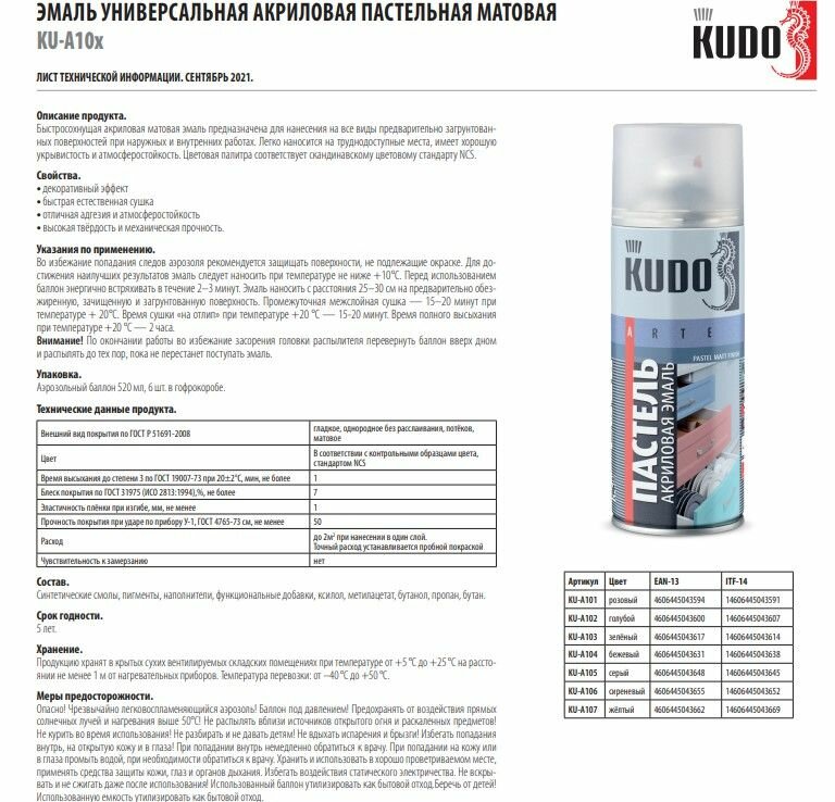 СохранитьАэрозольная акриловая краска Kudo KU-A103, пастельная, 520 мл, NCS 0530-G10Y, зеленая интересное: