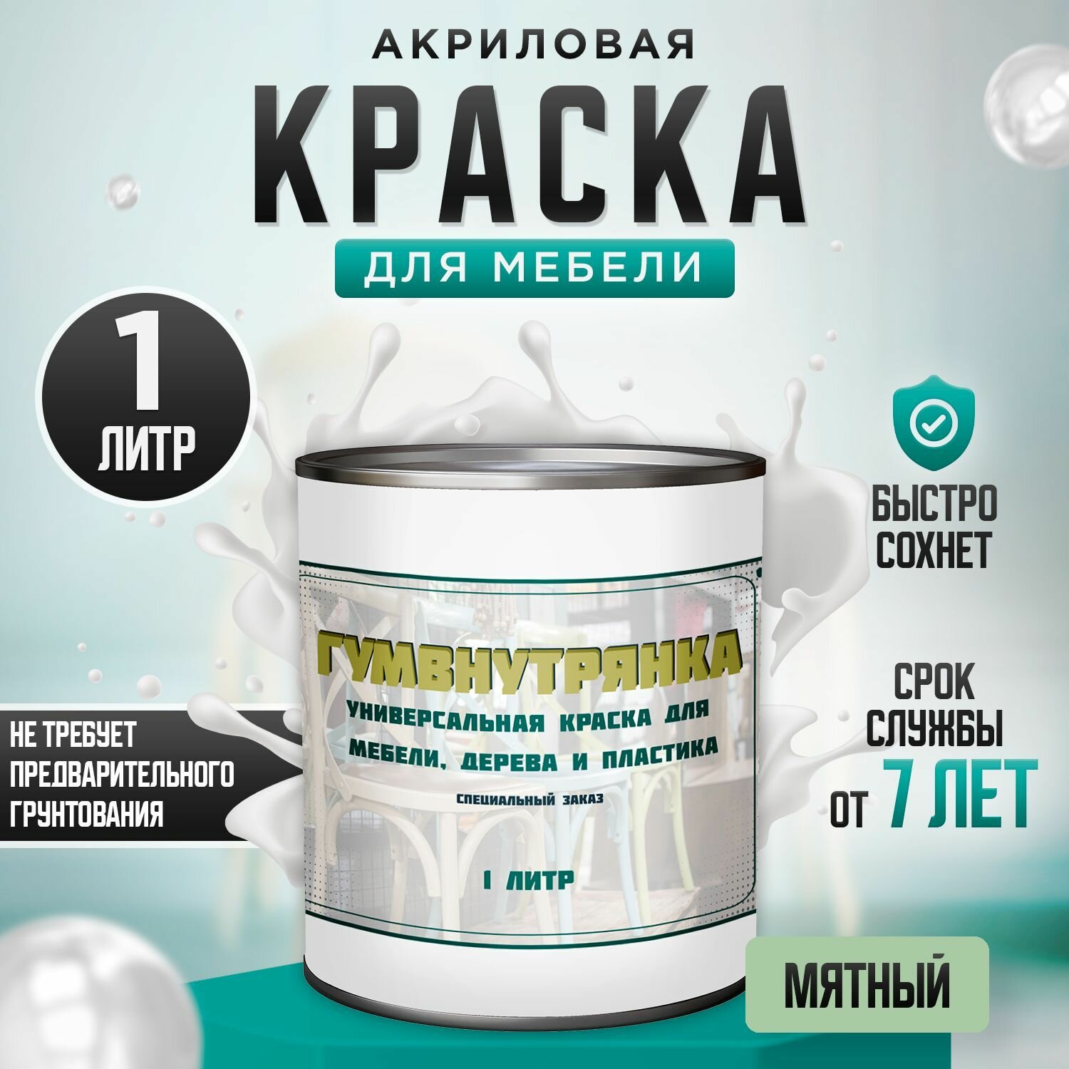 Купить Краска для мебели, дерева и пластика матовая без запаха Гумвнутрянка мятный 1 литр.