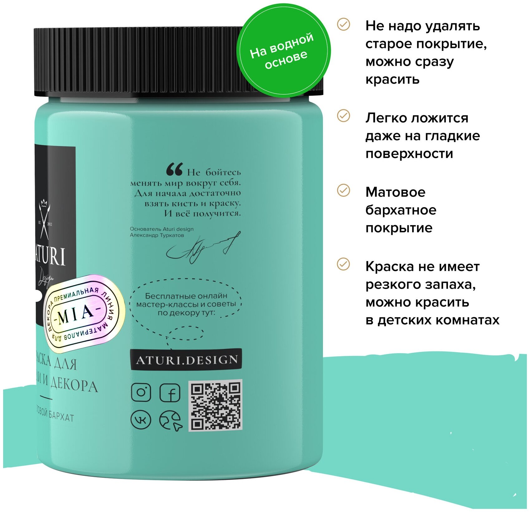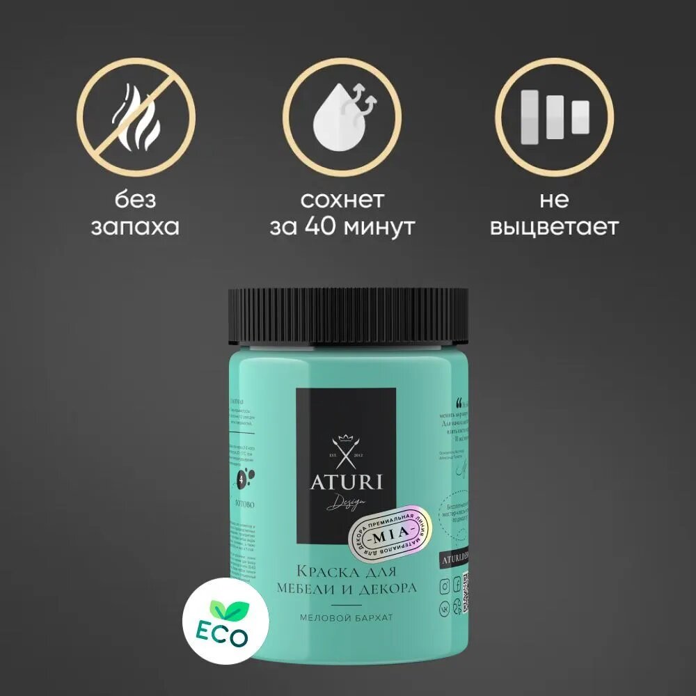 СохранитьМатовая краска для мебели 0,8 кг без запаха, меловая быстросохнущая мебельная Aturi Design Mia для декора, кухни и кухонных фасадов, дверей, пластика и металла. Цвет: Бора-бора, бирюзовый, мятный интересное: