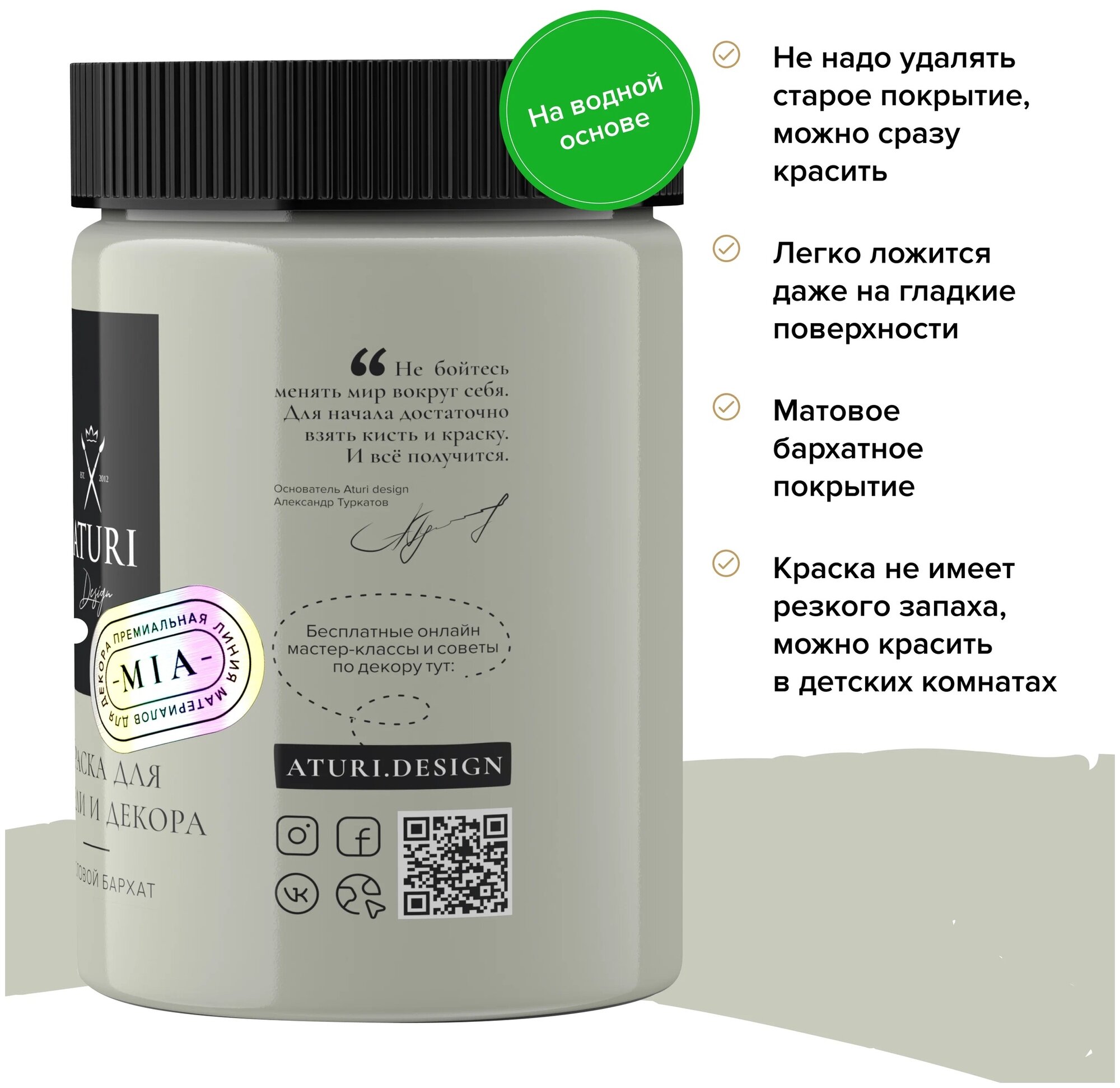 Краска Aturi Design Mia для мебели и декора, меловой бархат; Цвет: Сумеречная травинка, 400гр